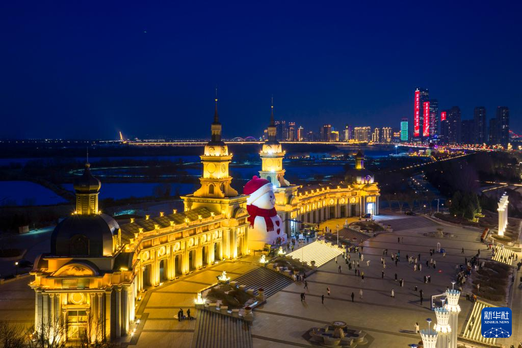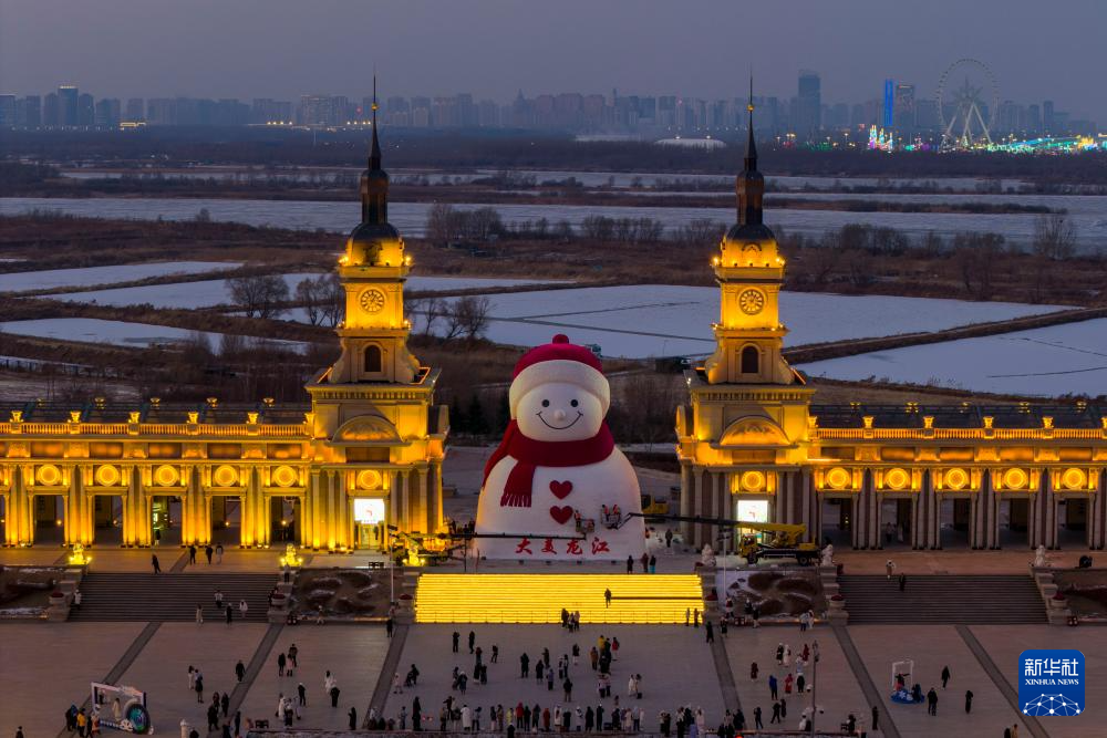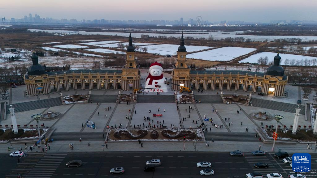 12月15日,游客在哈尔滨市群力音乐公园参观大雪人(无人机照片)。 张涛 摄