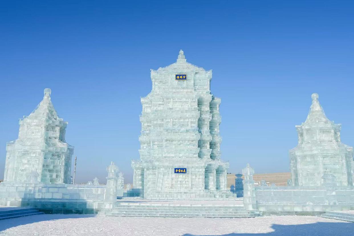 第二十七届哈尔滨冰雪大世界园区内的黄鹤楼冰建。(哈尔滨冰雪大世界供图)