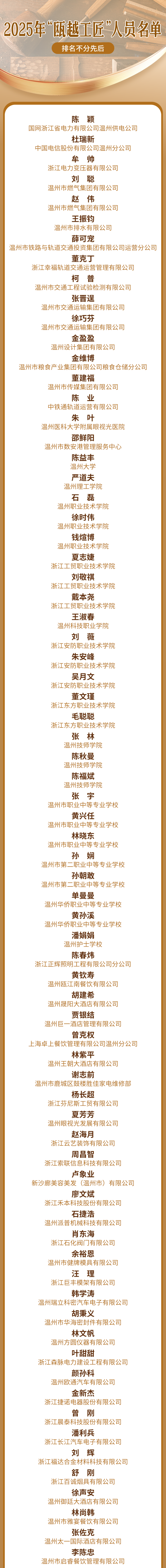 近日,2025年“瓯越工匠”人员名单公布。经申报推荐、专家联评、单位公示等程序,确定150人为2025年“瓯越工匠”人员名单,一起来看详细名单↓