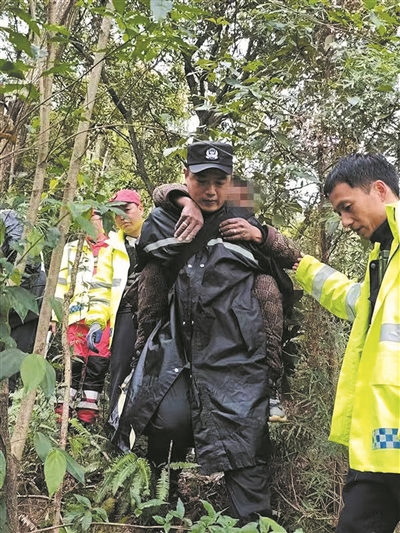 几名经验丰富的特警队员与救援人员相互配合,手脚并用徒手攀爬,借助岩缝和树根作为支撑,终于到达老人所在的地方。