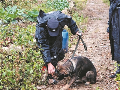 12月13日13时40分,警犬“贝塔”在训导员的指引下沿着山路仔细搜寻,行至一处三岔路口时,“贝塔”突然停下脚步,反复嗅闻地面与低矮灌木,耳朵警觉竖起,在原地转了两圈后,发出持续而稳定的吠叫声,并抬头看向右侧前方陡峭的山坡方向。“有反应,这个方向。”训导员的一声呼喊,让现场所有人精神一振,搜索范围从整片山区精准收缩到一条具体路径。