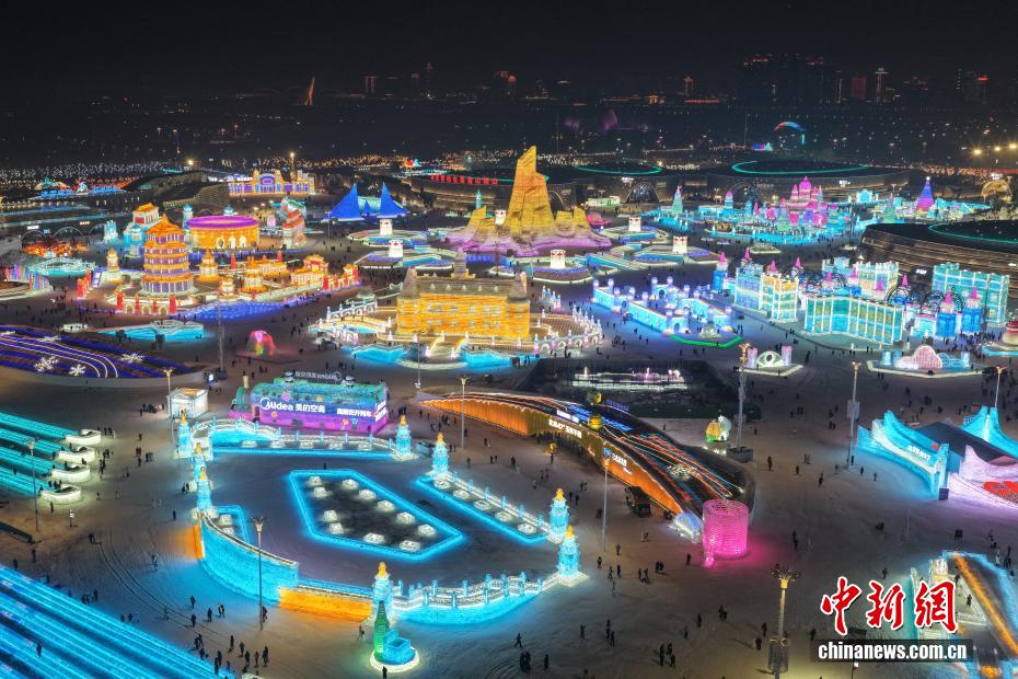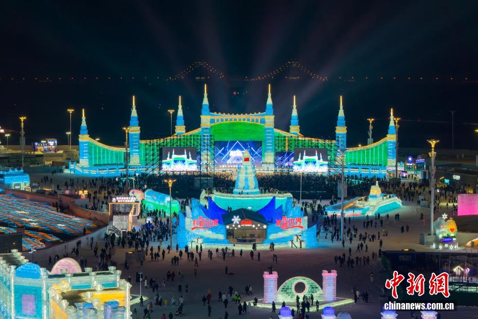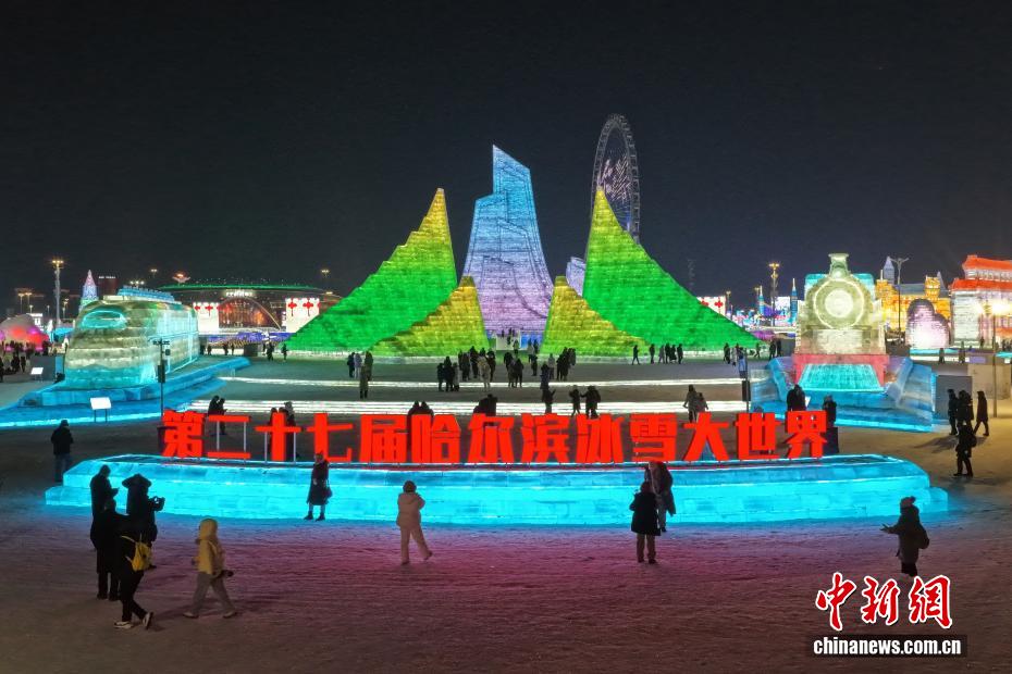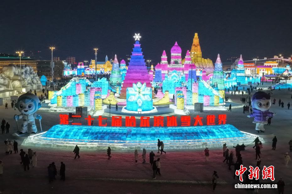 12月17日,第二十七届哈尔滨冰雪大世界开园,本届冰雪大世界以“冰天雪地童话世界”为主题,园区整体面积扩大到120万平方米,用冰用雪量达40万立方米。随着夜幕降临,冰雕景观一一亮起,整个园区仿佛一座流光溢彩的童话王国。中新社记者 赵宇航 摄