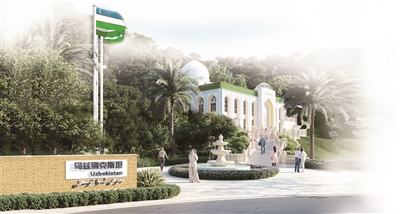 步入乌兹别克斯坦园,游客将亲身体验一场以园林为载体的丝路文明对话。园内每一处设计,都融入了对陆海丝绸之路互联互通的思考。