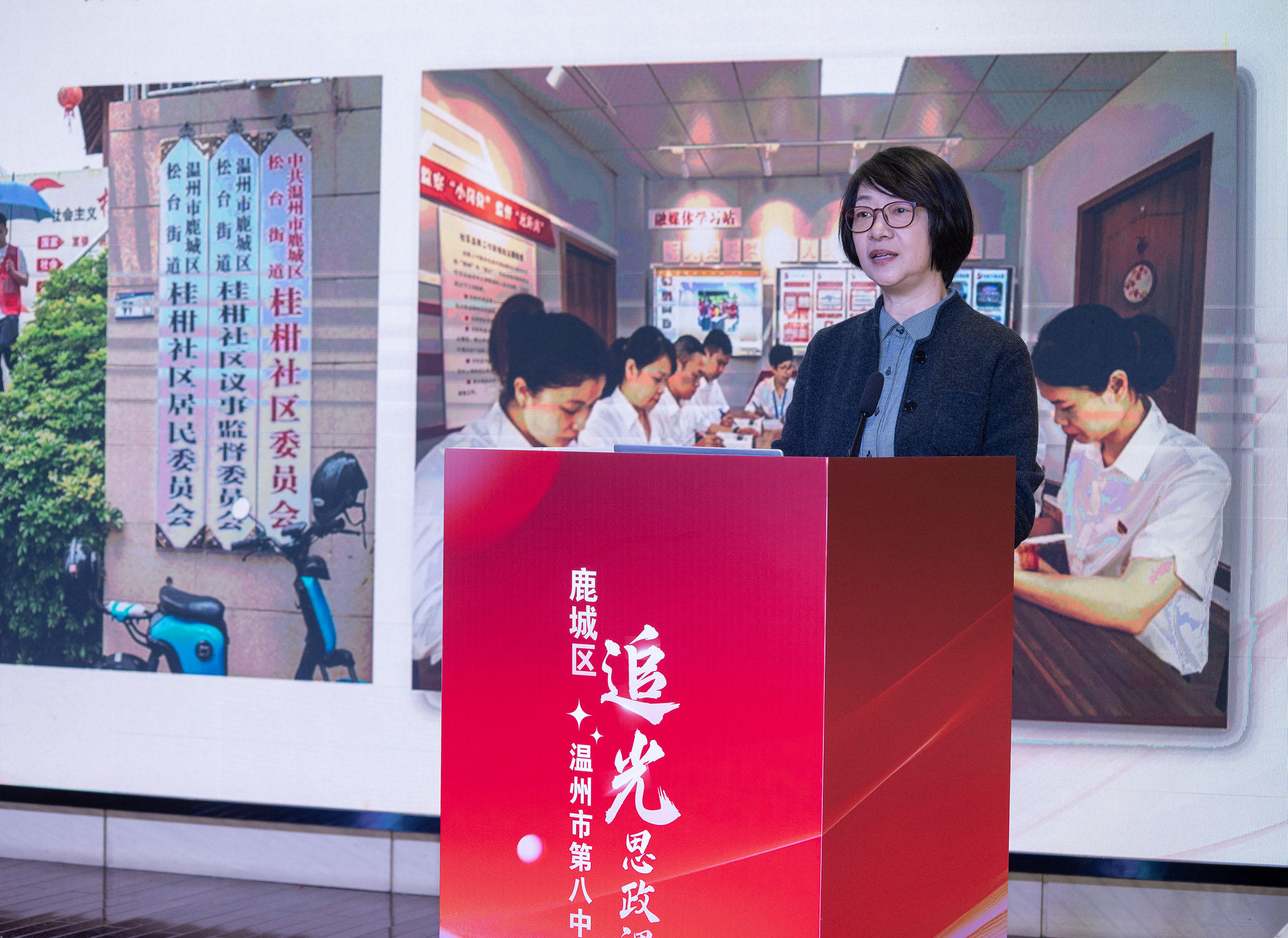 第十三届全国人大代表、鹿城区关心下一代工作委员会副主任柯建华被人们亲切地称为“小巷总理”,在社区一干就是22年,今天她把社区的温暖带进了课堂。她通过一张张照片、一个个故事,向同学们展示什么是“家门口的守护”。从慈孝生日会到儿童观察团,她让同学们看到,平凡岗位上的坚守如何汇聚成一座城市的温度。她说:“心中有光,脚下就有路。愿我们都能成为那个温暖他人的人,因为给予的快乐,永远是最珍贵的收获。”这番话如春风化雨,悄悄浸润着少年们对社会责任的最初理解。