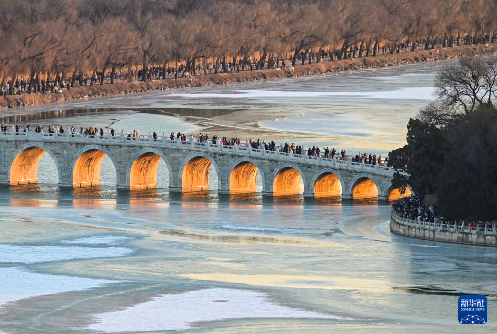 12月21日是冬至节气,北京颐和园十七孔桥的“金光穿洞”景观吸引了众多游客与摄影爱好者观赏拍摄。这是12月21日拍摄的颐和园十七孔桥“金光穿洞”美景。新华社记者 陈晔华 摄