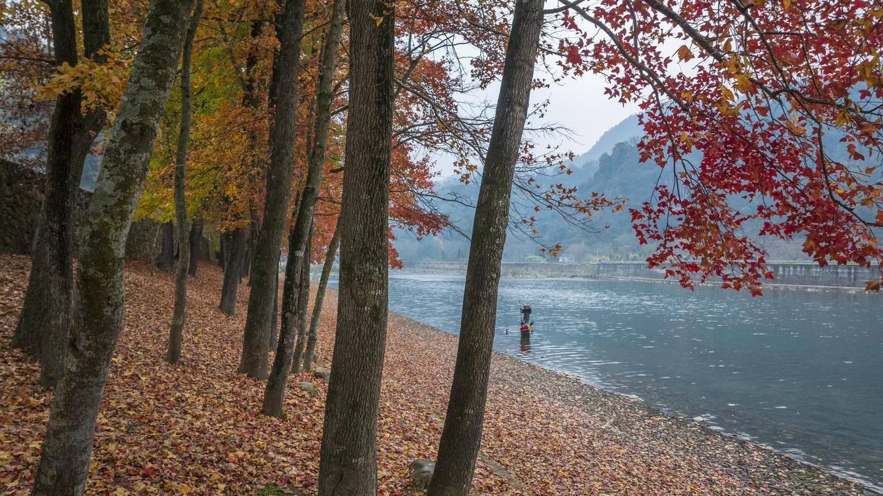 枫叶的另一侧是清澈见底的楠溪江,江面上头戴竹笠、身披棕褐色蓑衣的船老大撑着竹篙,缓缓驶入,就像一幅流动的油画,绚烂美丽。徐永义 摄