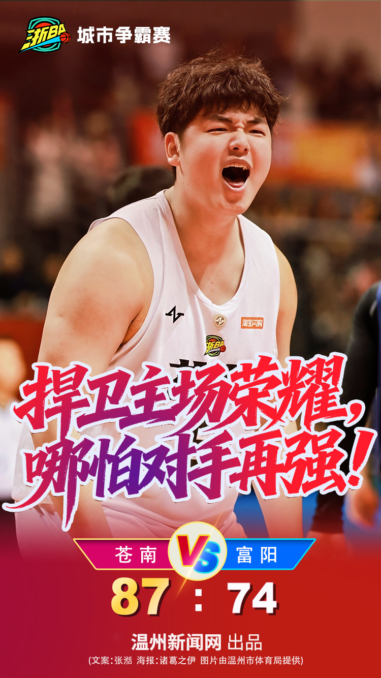 温州网讯(记者 温婉)12月25日晚,苍南县体育中心体育馆座无虚席,浙BA城市争霸赛B组焦点战火热上演。主场作战的苍南队迎战B组“榜一”富阳队。开场后,苍南队率先发挥,频频取分,打出梦幻开局。下半场,苍南队稳扎稳打,顶住对手反扑压力,最终以87:74击败强敌,成功报首回合失利之仇。
