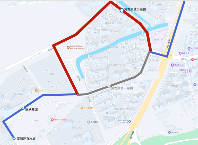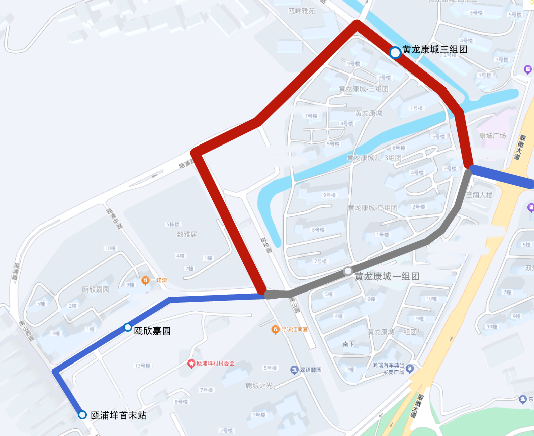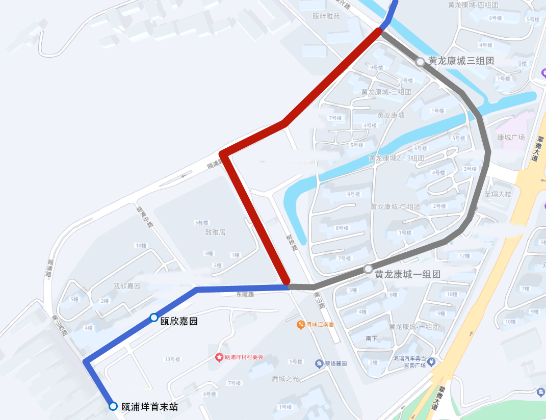 由瓯浦垟首末站始发,原线行驶至南山东路与东瓯路交叉口,左转改经南山路、瓯浦路、康城路,恢复原线至聚欢家园首末站(往返)。