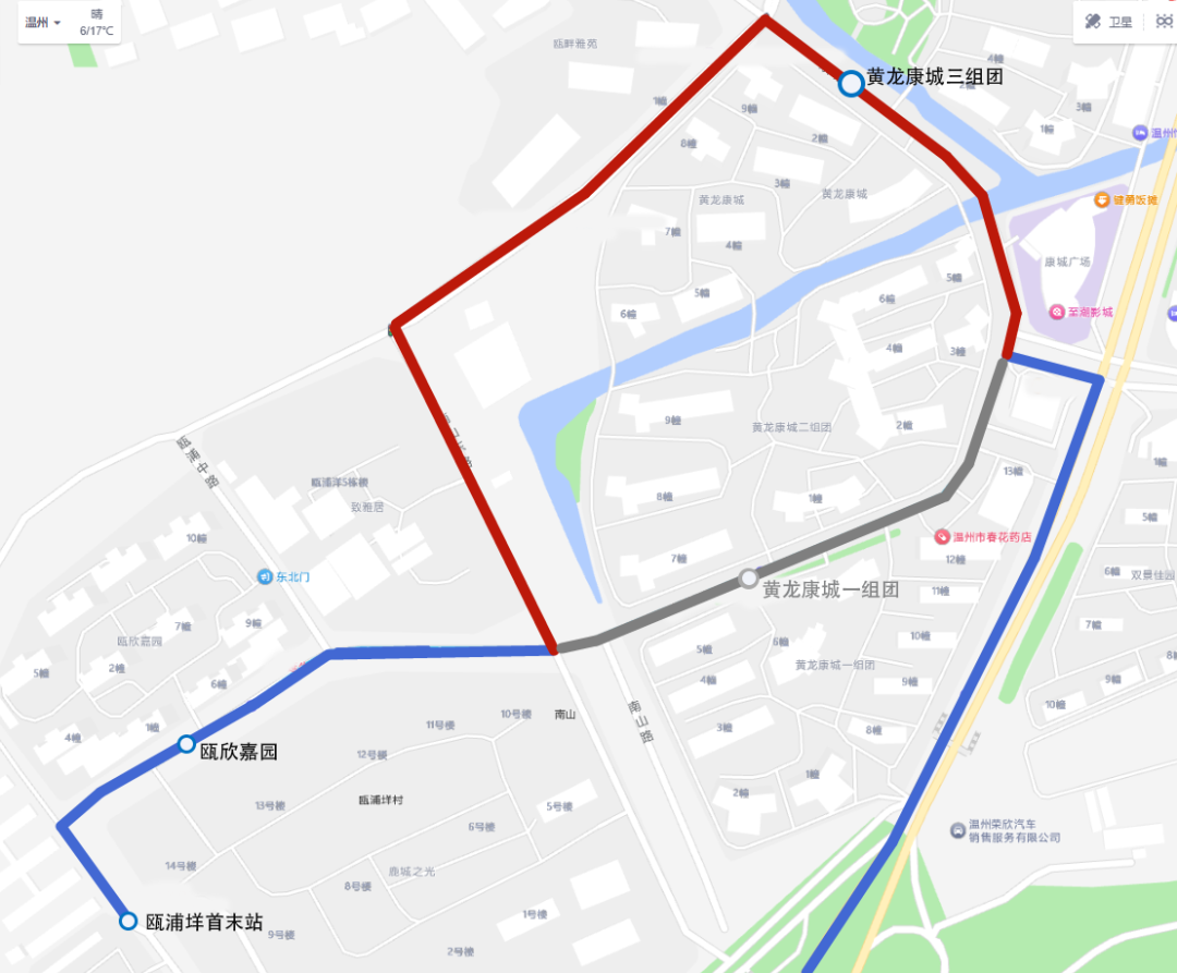 由瓯浦垟首末站始发,原线行驶至南山东路与东瓯路交叉口,左转改经南山路、瓯浦路、康城路,恢复原线至瓯浦垟首末站(环线)。