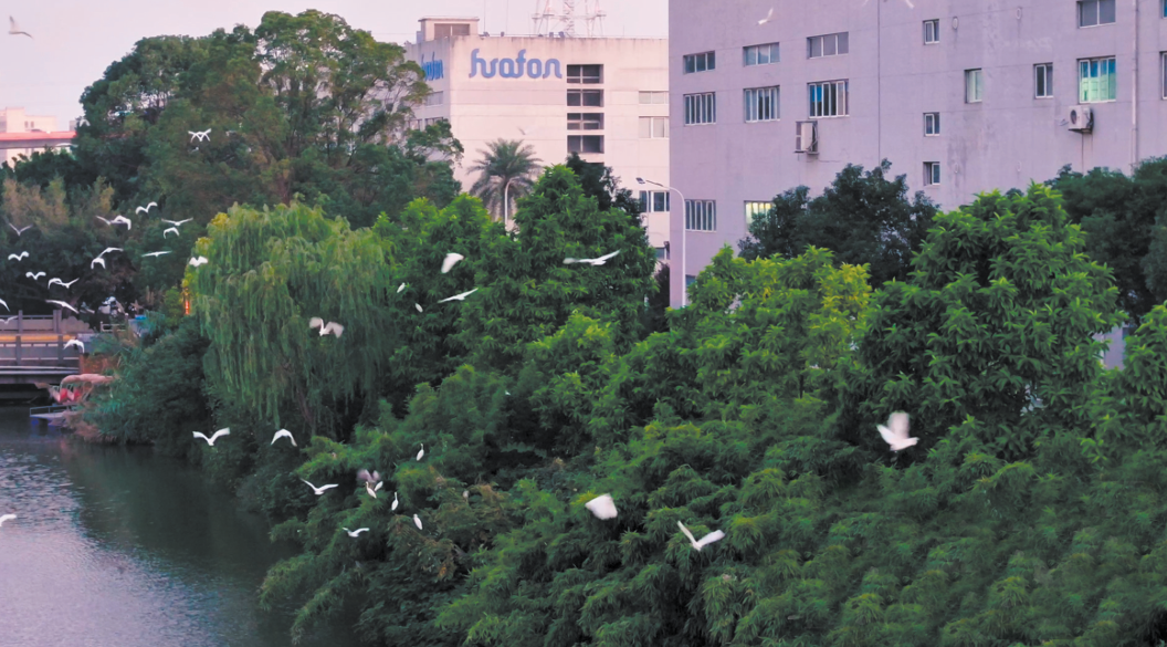 “初代环保大使”的繁衍生息引来了新的访客。“2020年开始,陆续有白鹭飞到河边捕鱼,后来越聚越多,如今已有上百只的规模,最近我还在草丛里看到鸟蛋了。”华峰集团物业人员薛丰雷说,这些“白衣精灵”清晨飞出、傍晚归巢,作息与人相近,为公司员工的上下班时段平添不少乐趣。