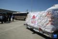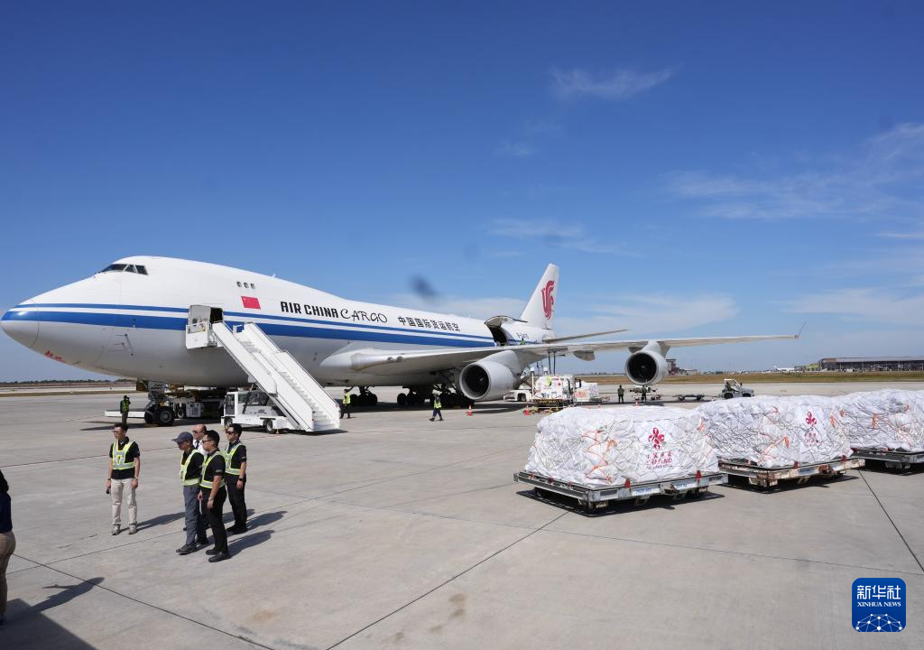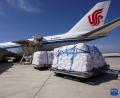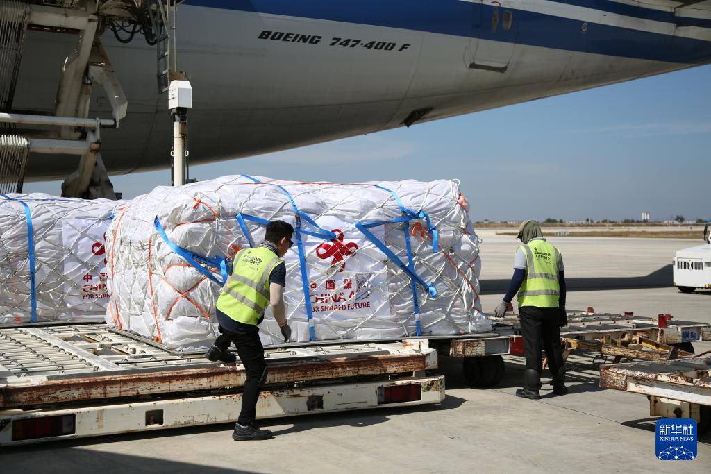 中国政府向柬埔寨提供的首批紧急人道主义援助物资28日运抵金边德崇国际机场。(中国驻柬埔寨大使馆供图)