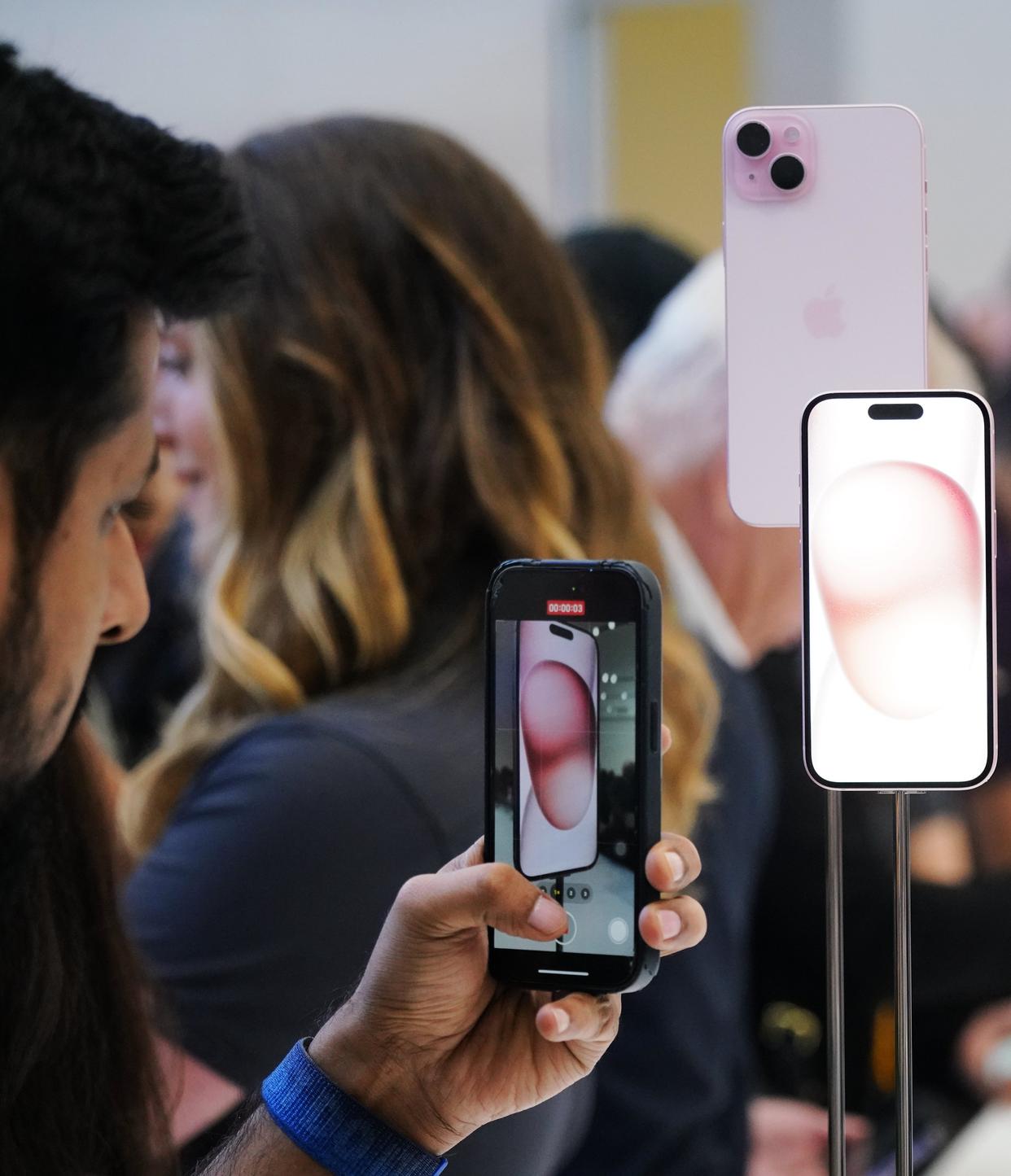 2023年9月12日,在美国加利福尼亚州丘珀蒂诺市举行的苹果新品发布会后,人们体验新品。新华社记者吴晓凌摄