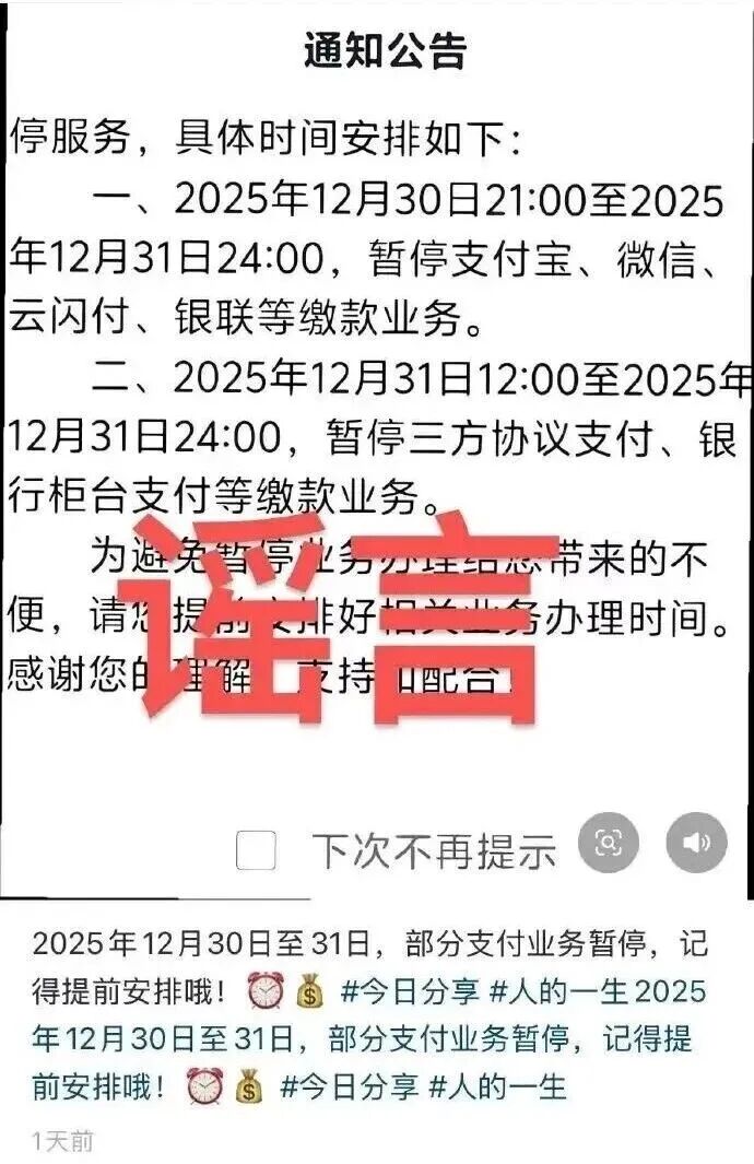 近日,在一些社交平台上,“12月30日、31日支付宝、微信支付不能使用”的消息流传。