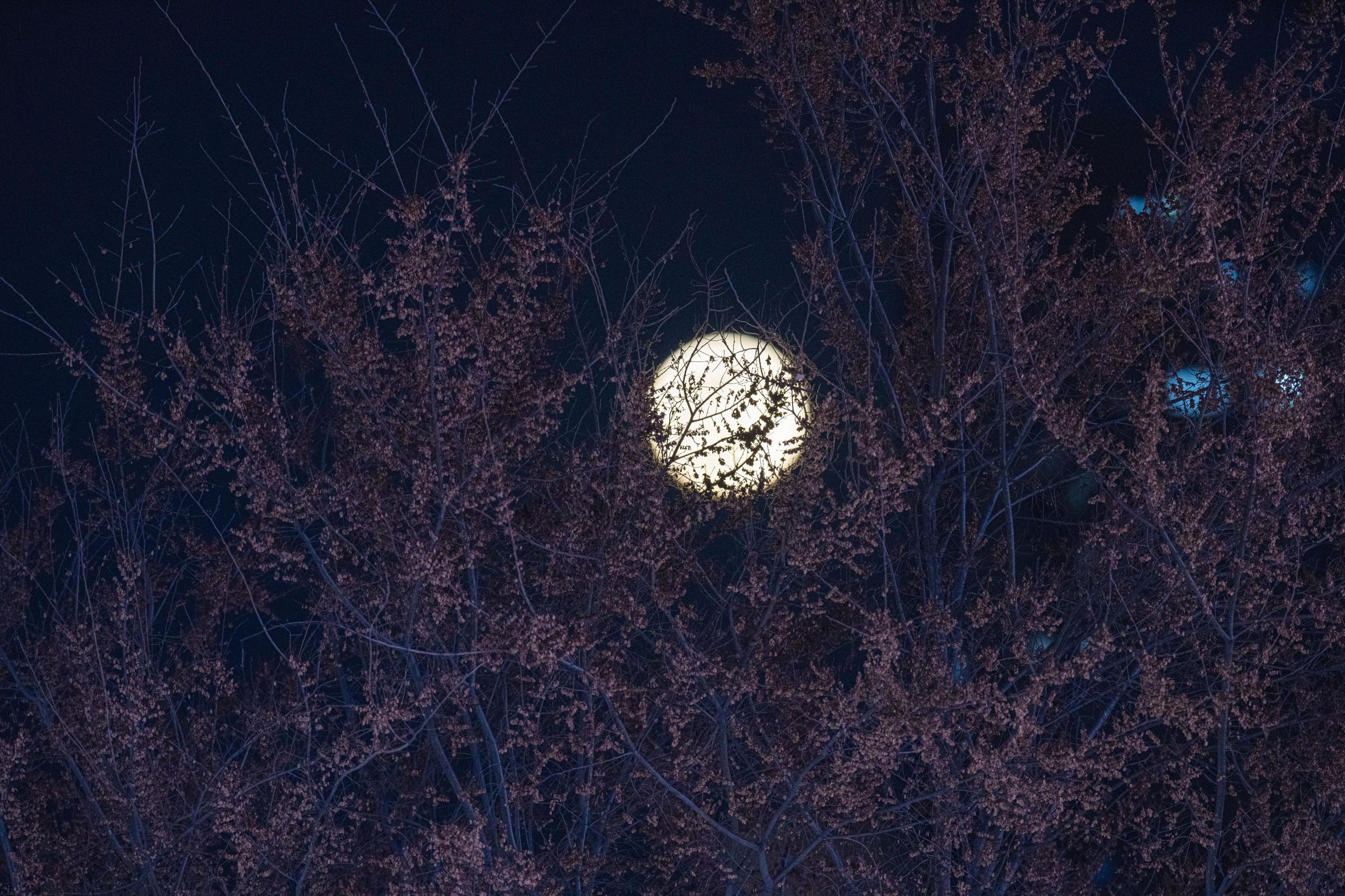 2026年1月3日晚,2026年首轮超级月亮惊艳亮相,温州街头树枝与月影相融,绘就独特静谧夜景。