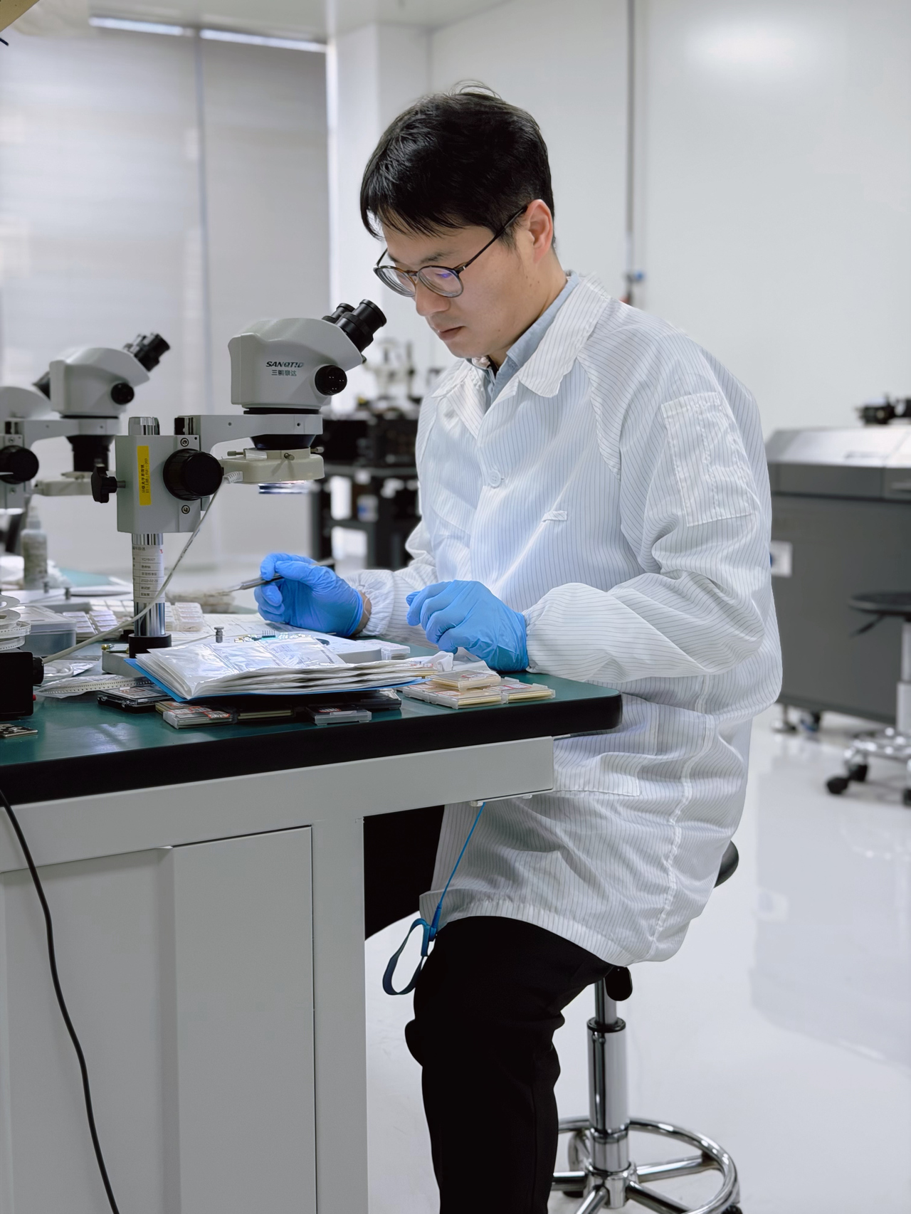 毕秀文在测试实验室检查晶圆成品。受访者供图