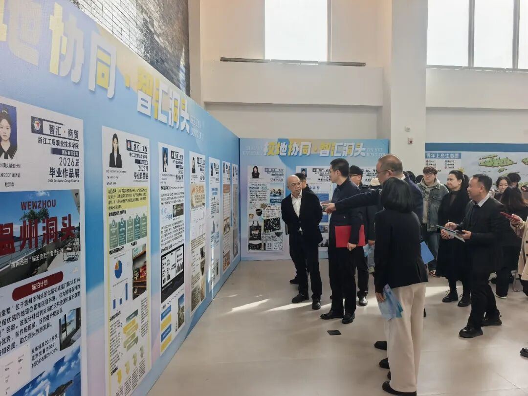 展厅里,从温州非遗贝雕文化的短视频科普,到杨梅供应链的数智化转型方案,以及本土企业的电商实践报告,每一件作品都凝结着学生们在海岛走访、调研与思考的印记。