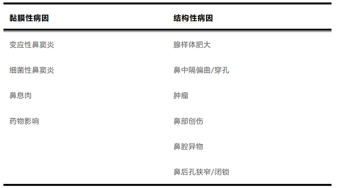 造成口呼吸的原因,可分为黏膜性病因和结构性病因。黏膜性病因是因为过敏、感染等原因导致鼻黏膜肿胀,进而引起鼻塞;而结构性病因,是因为鼻腔结构异常,比如异常增大的腺样体、肿瘤、异物等阻塞了鼻腔,先天性鼻畸形比如鼻中隔严重偏曲、鼻后孔闭锁等导致鼻子不能正常通气。