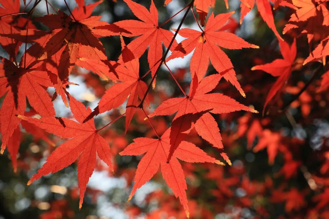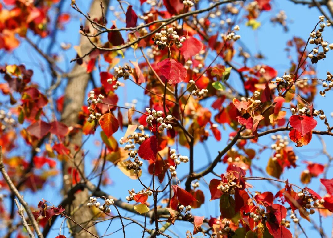 乌桕最是俏皮,心形的叶片染透了胭脂红与杏黄,点点白籽缀于枝头,如同雪与火的共舞,在巷弄转角给你一抹明亮的惊喜。