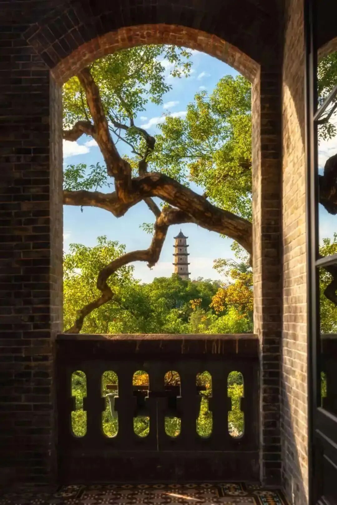 青砖拱券镌刻着19世纪的开埠记忆,而今它成了时光的画框——在英国驻温州领事馆旧址的廊檐下远望江心西塔,看见的是历史与风景的叠影。