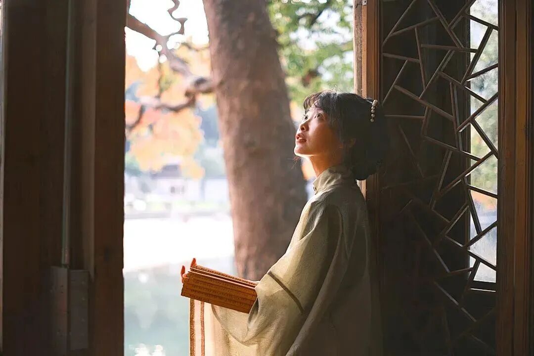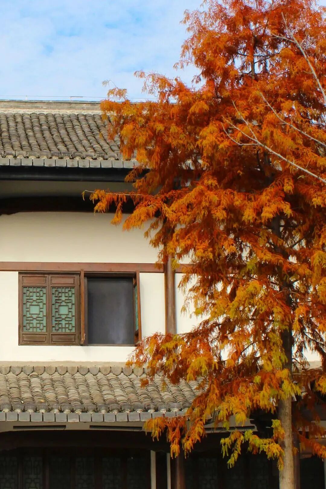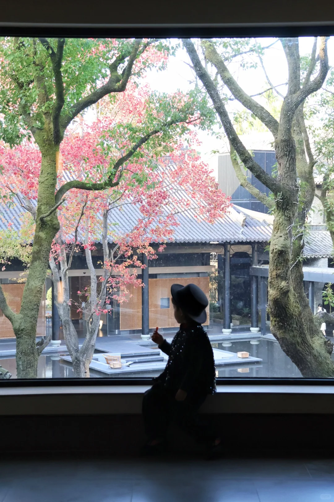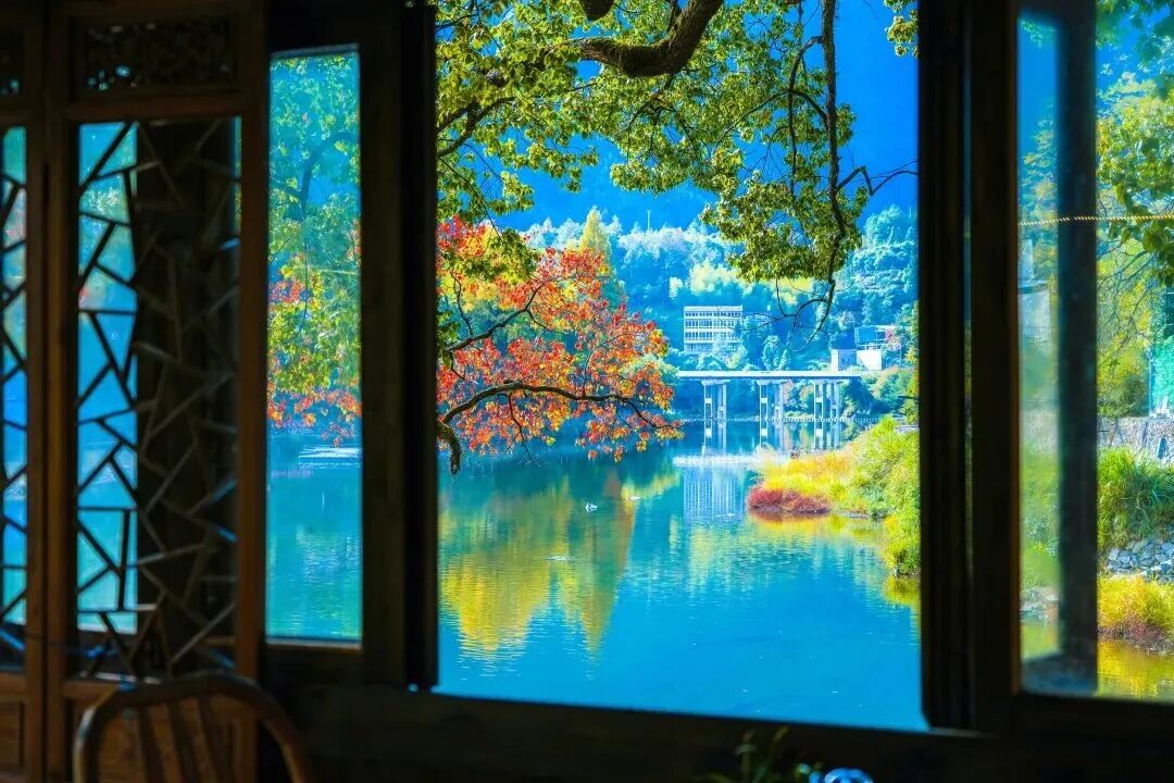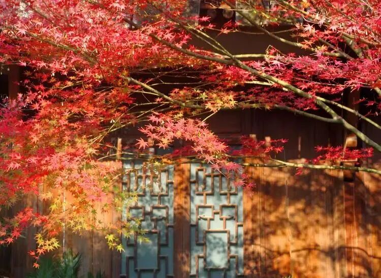 在五福园的幽静处,鸡爪槭与红杉轻倚木窗,枝头的红意悄然漫过窗格。透过素壁上的月门与丽花亭的拱券,悄然框出一幅宋韵流转的园林画意。