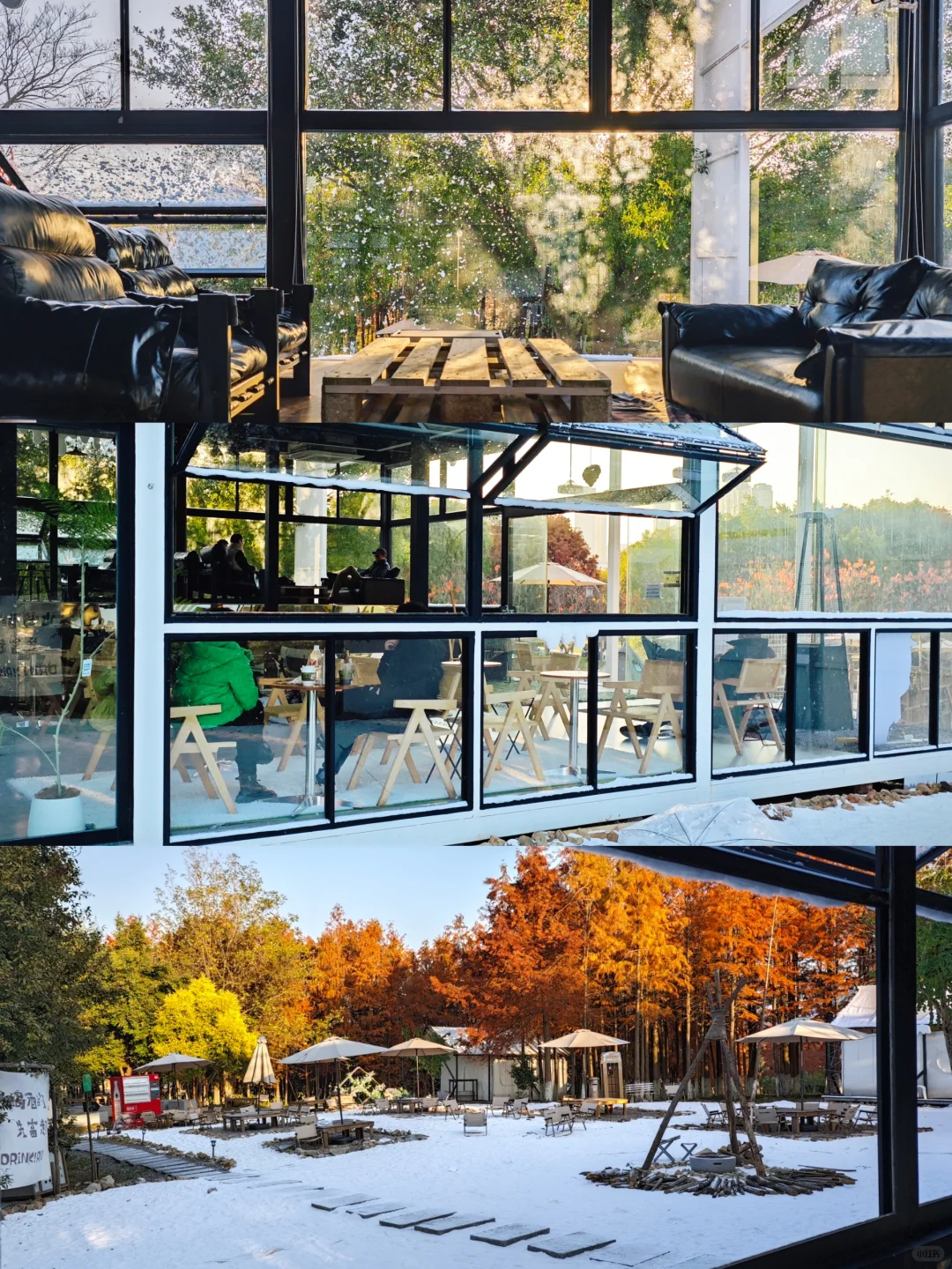 透过大可营地的落地窗,看雪与红杉,一窗之内是暖意,一窗之外是童话。