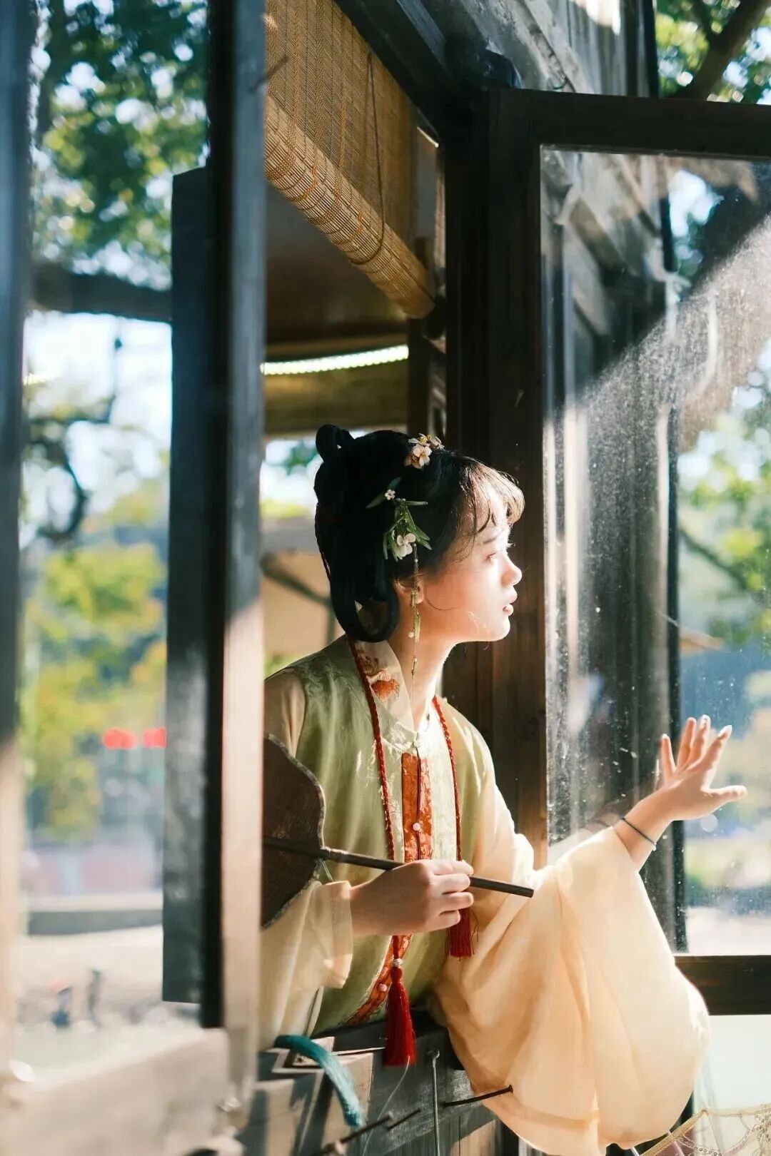 北涧桥旁的茶馆里,目光越过窗棂便是卧水的碇步与婆娑树影——流水潺潺,正把窗外的时光调得缓慢绵长。