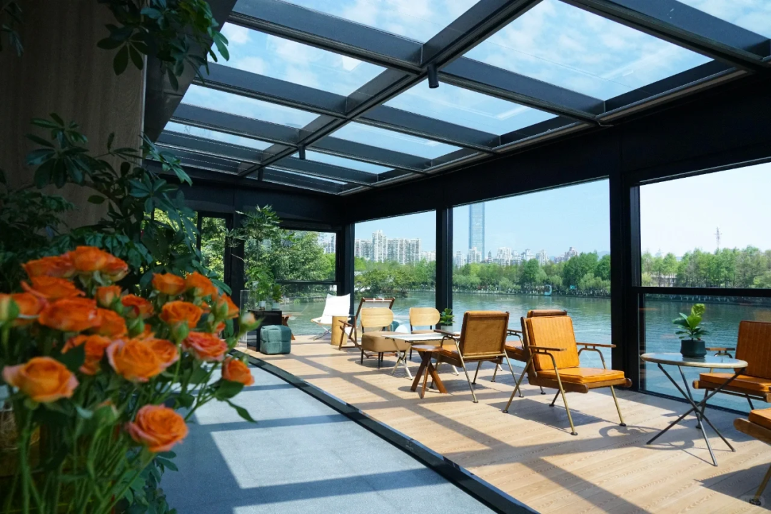 一面是塘河,一面是公园,这家人才友好咖啡厅,从每个方向看出去,都能赏到不同的窗景。