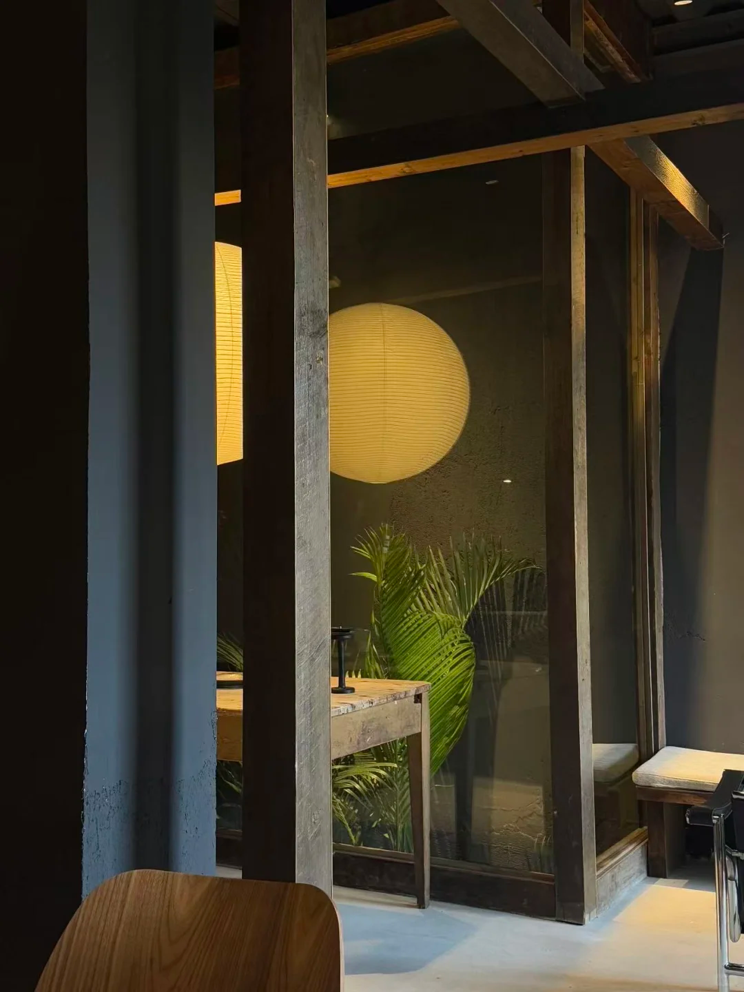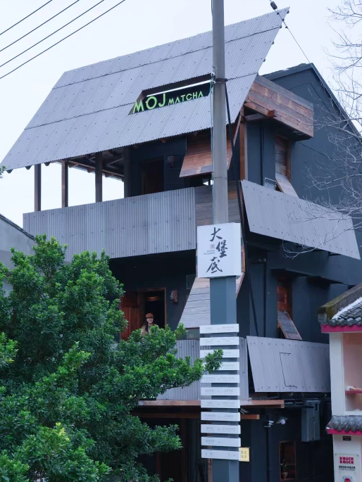 当梧田老街的古韵遇见MOJ MATCHA的清新,深灰色墙面与工业风的金属檐角,同老街的旧意交织出温柔反差。