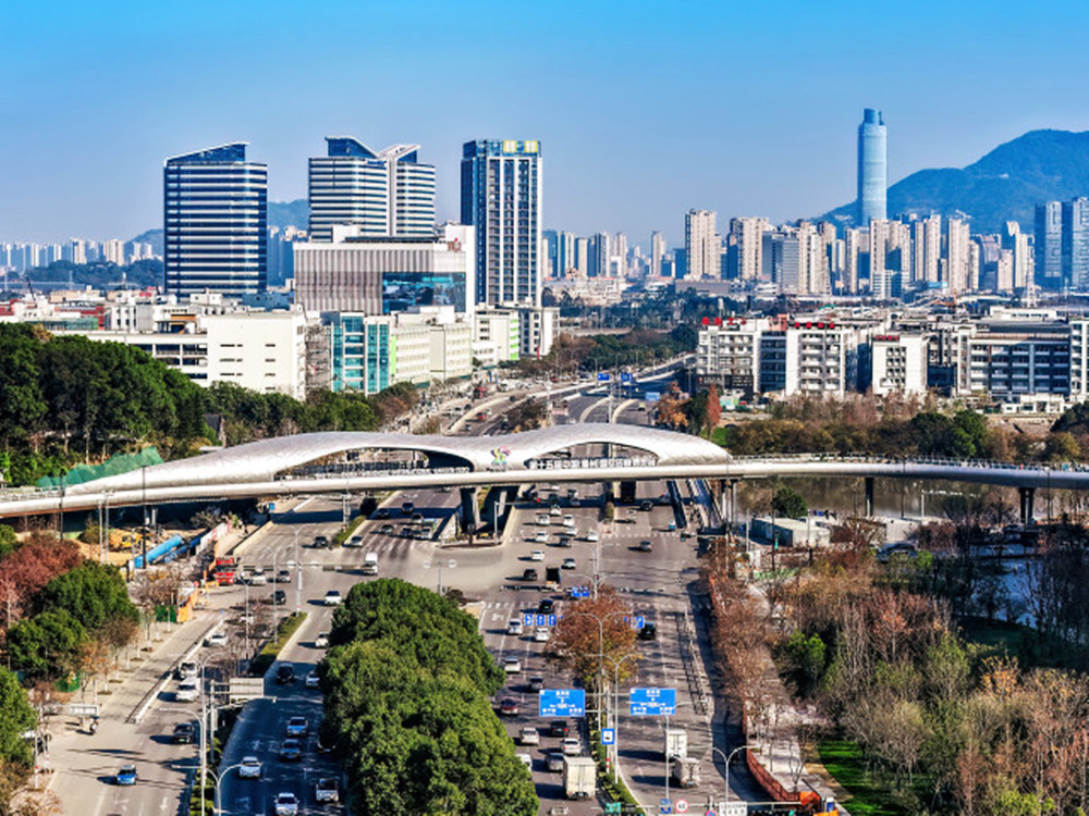 桥梁全长467.62米,桥宽10米,上跨瓯海大道和皎巨路,采用钢结构设计。陈明铭/摄