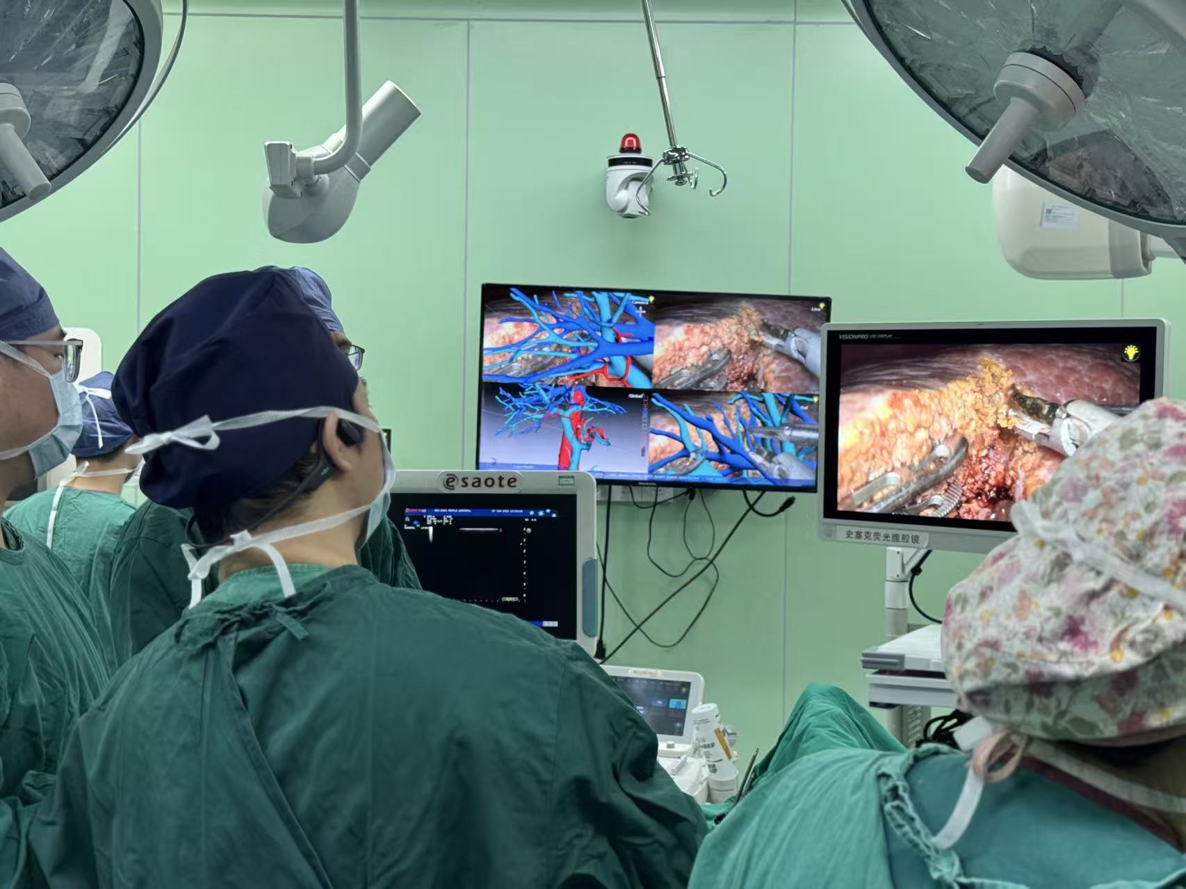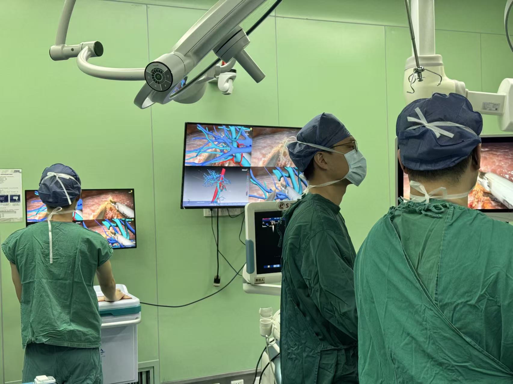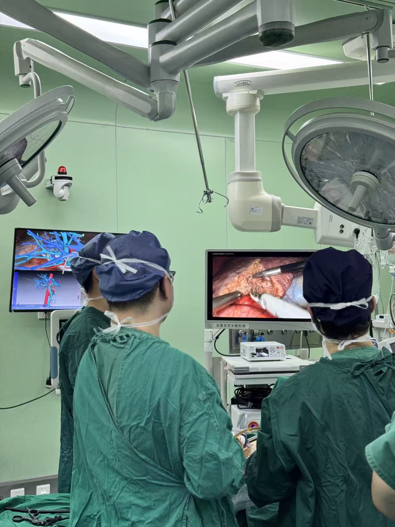 手术中,全息影像导航系统将术前重建的三维模型实时叠加至腹腔镜视野,肿瘤边界、重要血管走向及预定切除平面清晰可见。“哪怕是仅一两毫米粗的细微血管,也能精准识别,避免术中误损伤。”胡逸人介绍,当手术中肝脏形态因切除发生较大变化时,还可通过B超补充定位,形成“双保险”,确保手术全程精准可控。