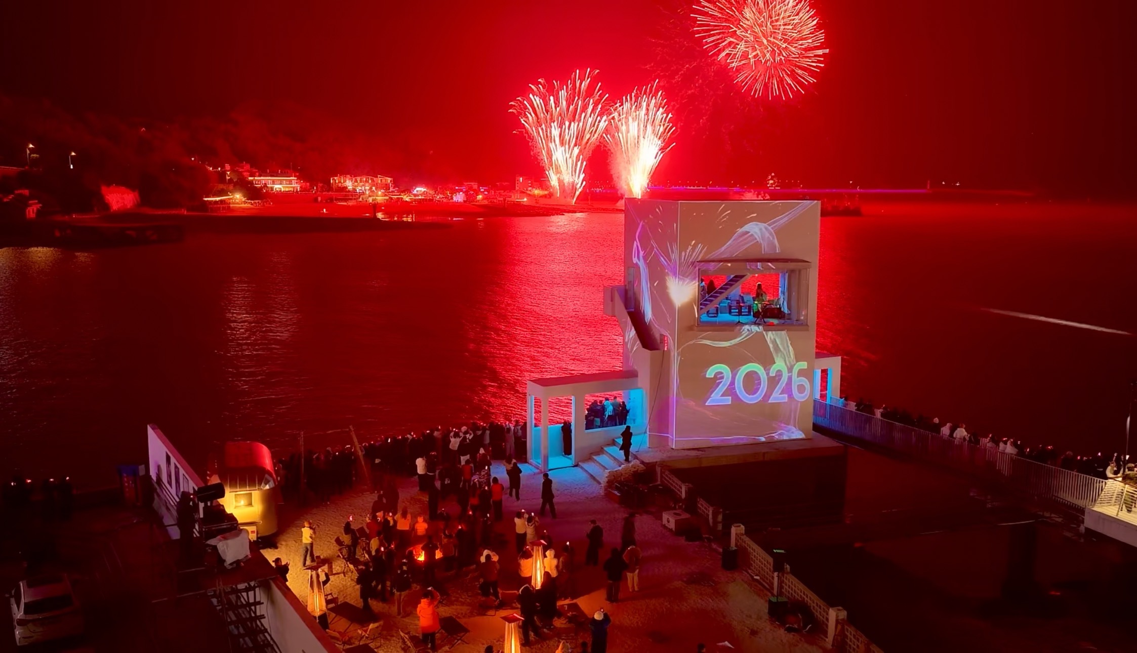 跨年夜,这座尘封多年的工业遗存建筑“解冻”,音乐与光影交织,数字烟花秀与裸眼3D建筑光影秀点亮夜色,惊艳了海边的游客。