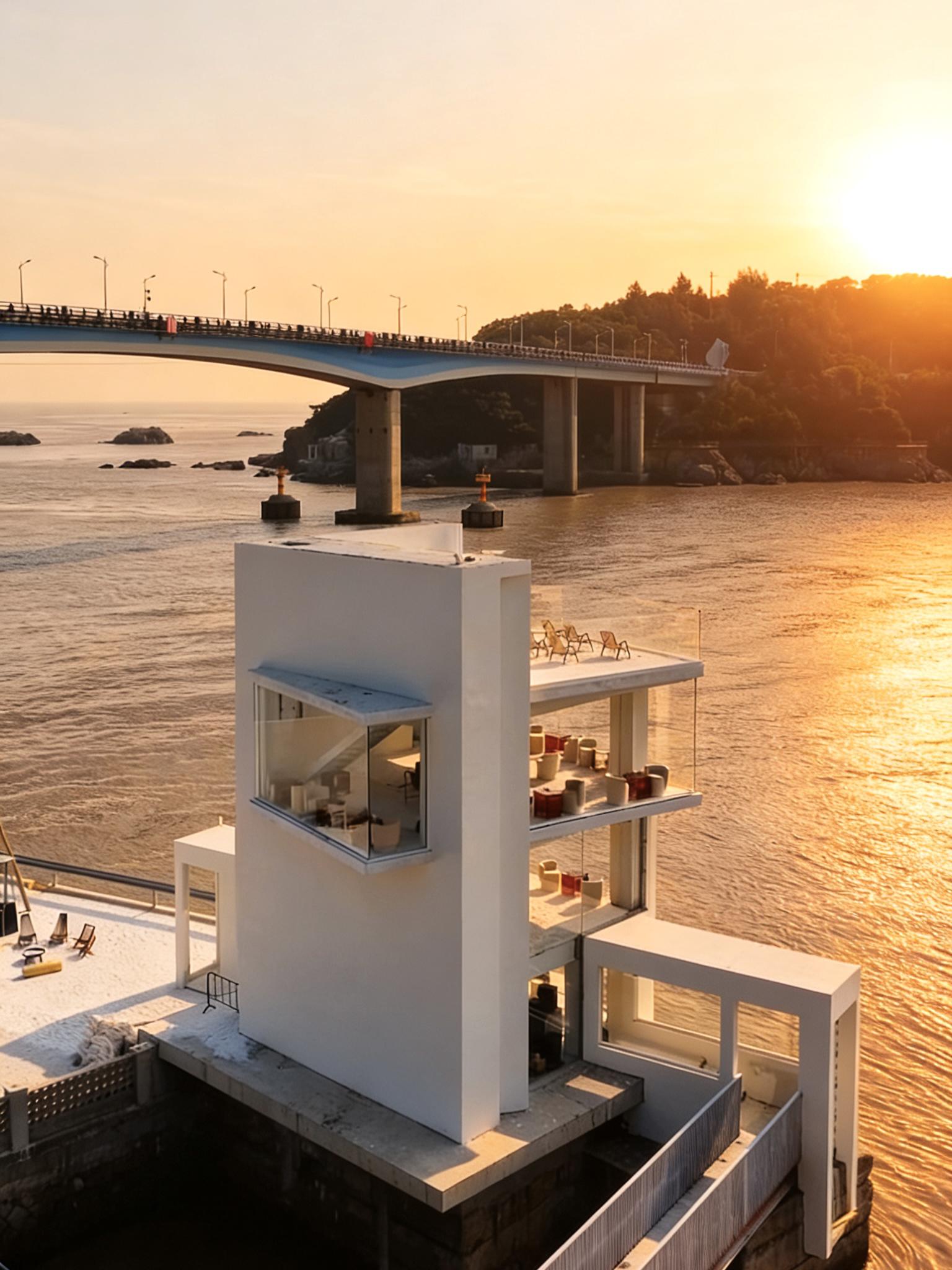 “冰厂”并不局限于一栋独立建筑的室内空间与咖酒业态,而是联动建筑外立面、户外广场、廊桥,辐射海域,打造深度沉浸体验。“面朝大海,让潮汐与日落抚平焦虑——‘冰厂’提供的‘在地疗愈’独一无二。”