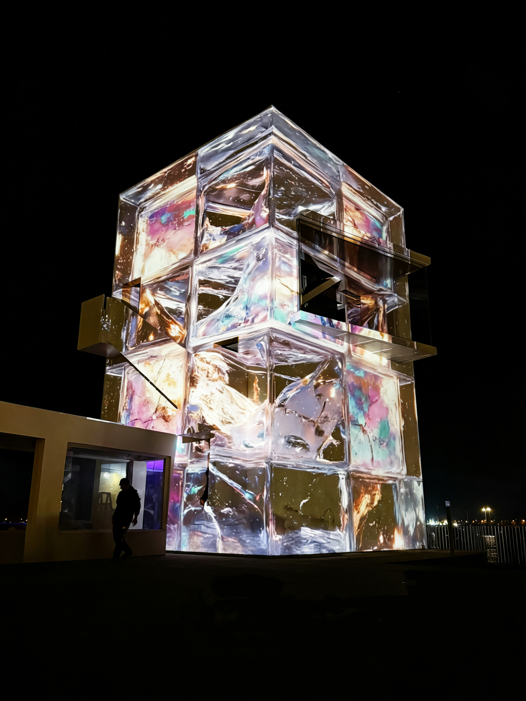 夜晚“冰厂”楼体建筑投影呈现冰块形态