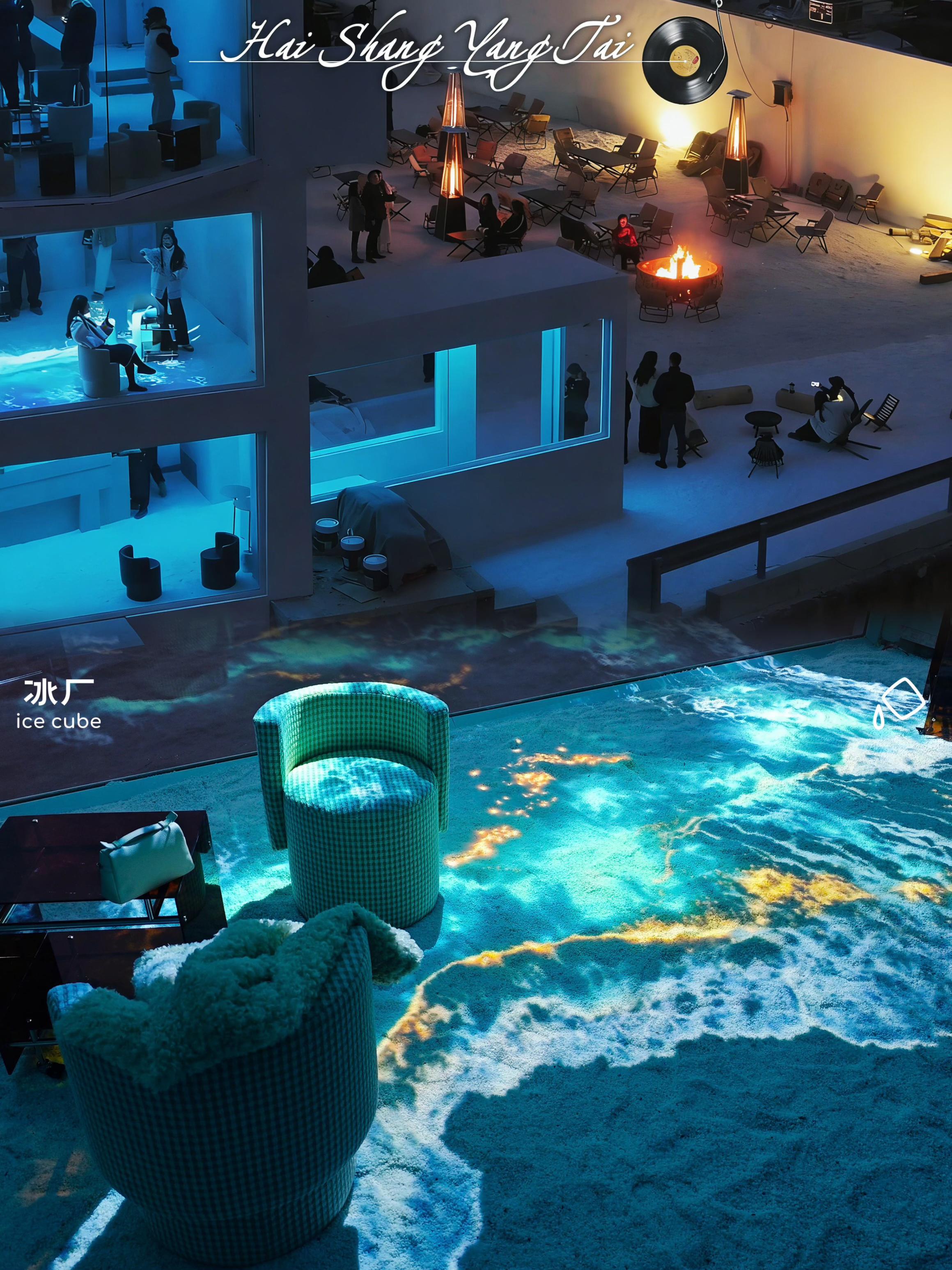“我们在极简肌理里,植入了一整套领先的数字展示系统。”团队成员栗子介绍。建筑立面化身巨幕,裸眼3D Mapping技术令光影故事随夜幕上演;室内二楼,地面投影装置在“日落蓝调”(17时~19时)与“夜晚”(19时~24时)时段切换海浪与蓝冰主题场景。通过数字艺术家的内容创作,时间在此有了质感:不同时刻、不同节庆踏入“冰厂”,体验皆焕然一新。