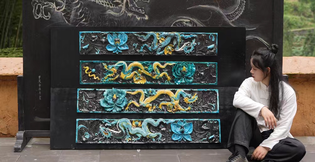 第二次,她更谨慎、更坚定。历经整整三个月的自然阴干,再入高温素烧;随后施以黑底为基、蓝黄为主调的传统釉色,最终在820℃的釉烧中涅槃重生——一块流光溢彩的龙纹琉璃砖,终于在她手中“复活”。她特意将每幅切成五块——整整二十块,刻意还原了文物当年被切割运往海外的伤痕状态,让美与痛一同被看见。