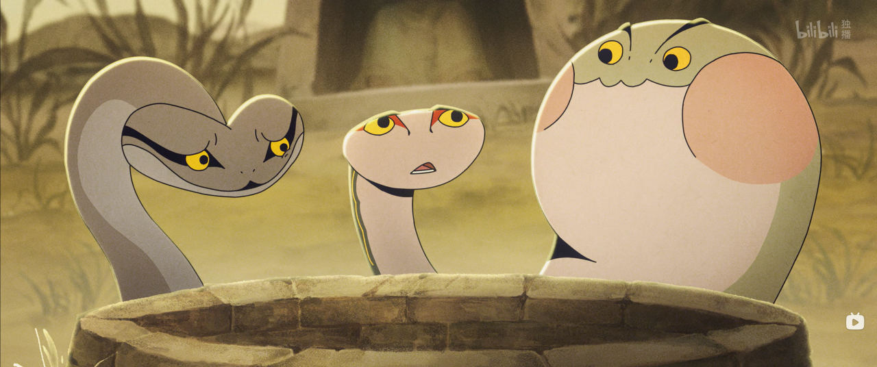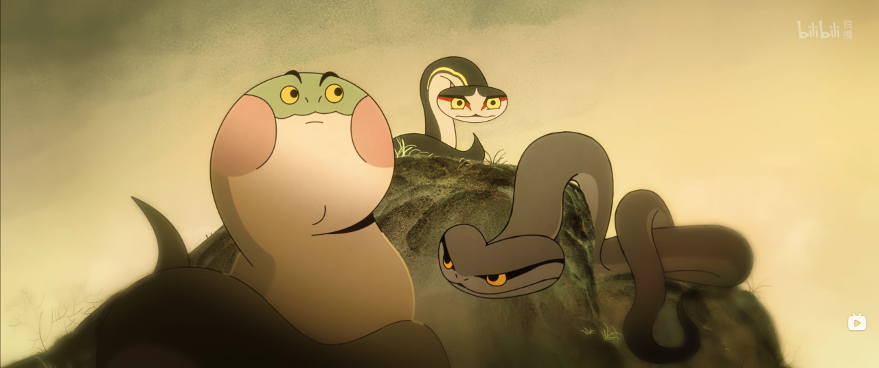 为了攻克这一核心难题,梦卜动漫进行了多管齐下的探索。“我们投入大量时间进行生物观察与表演研究。”韩策介绍,团队不仅查阅蛇类运动学文献、分析真实骨骼与肌肉运动,还反复钻研《大闹天宫》《哪吒闹海》等经典,学习如何通过躯体曲线、头部姿态与眼神传递情绪。在作画监督统筹下,他们为三条蛇建立了差异化的表演体系:身形矫健的蛇老大,以流畅曲线与快速停顿突显领导力;性情激烈的蛇老二,用频繁扭动与突然收缩表现张力;温顺憨厚的蛇老三,则以低伏姿态与柔和摆动传递内向性格。