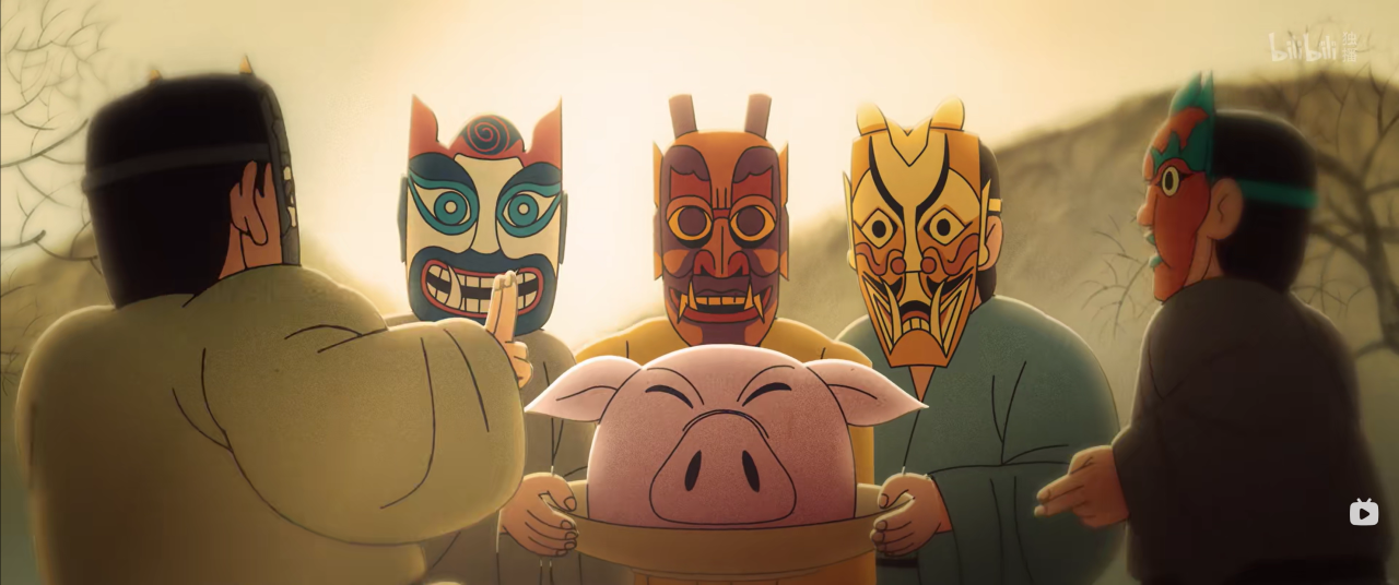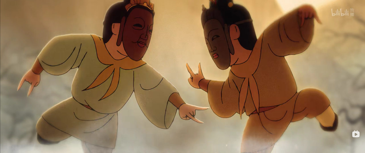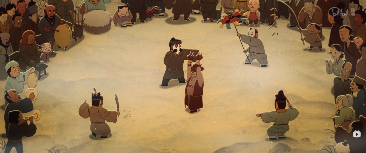 他们面临的另一重挑战,是将导演团队宏大的美学构想,精准“翻译”成可执行的动画语言。在村民形象塑造上,他们参考明代劳动者特征,运用类似水墨简笔的线条,刻画出因长期干旱与劳作而形成的粗糙皮肤质感。在动画中段一场盛大的傩戏场景里,四周围观的数十名村民各有其态,或交谈,或大笑,或张望,与中央表演者大幅度、快节奏的肢体动作形成戏剧性对比,共同营造出真实鲜活的市井气息。演出(负责原画检查工作)蒋辰君说:“这要求我们不能只聚焦主角,每个配角都是场景生命力的组成部分,工作量是成倍增加的。”这种对整体画面生动性的极致追求,正是该片拥有电影级质感的关键。