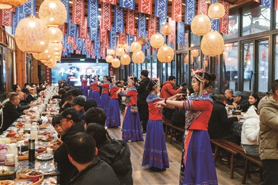 1月9日至11日,文成畲家长桌宴迎来十周年升级,首度推出“十大新趣玩法”,将原本一顿饭的体验,延伸为贯穿全天的文化之旅。宴席不仅保留经典畲味,更添“十鲜”新菜与“十味”流水翻牌形式,每道菜如拆盲盒般惊喜呈现。餐后,游客有的去体验“十镜”民族华服旅拍,在宗祠、廊桥等十大场景中记录风情大片;有的移步“十咖”畲味咖啡馆,倚窗品茗,感受畲乡慢时光。