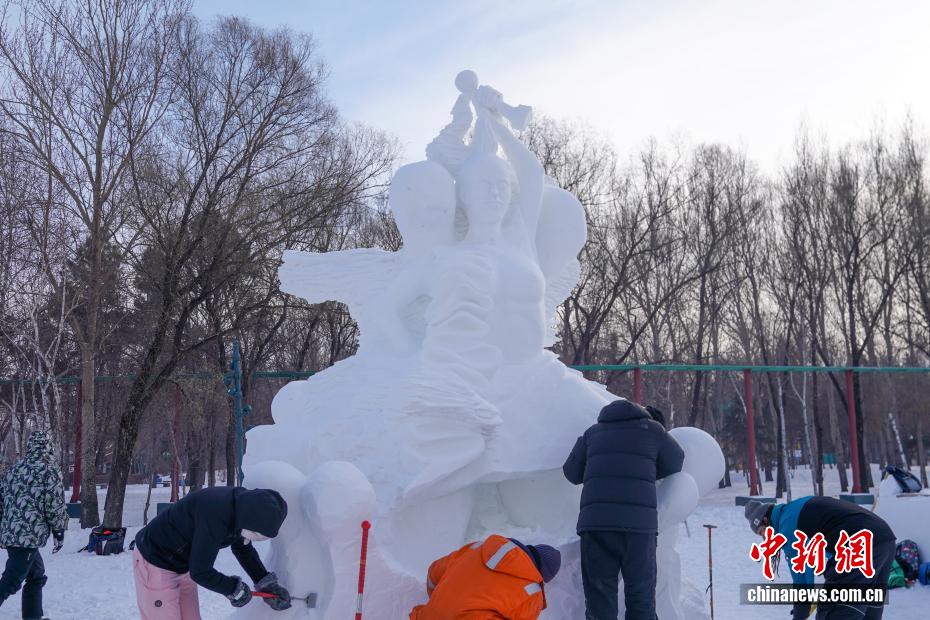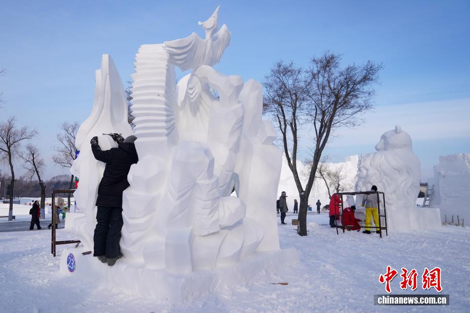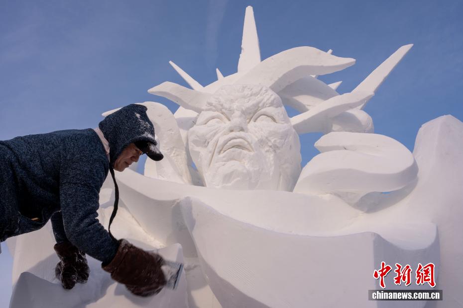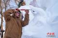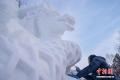 1月9日,第28届中国·哈尔滨国际雪雕比赛在太阳岛雪博会落幕,25件雪雕作品集中亮相。当日,在比赛现场,来自各国的百余位艺术家们正凝神专注做着最后的调整。据了解,本次比赛吸引来自白俄罗斯、比利时、波兰中国等13个国家25支代表队百余位艺术家参赛。图为蒙古队选手为作品《驯牛者》进行收尾工作。中新社记者 赵宇航 摄