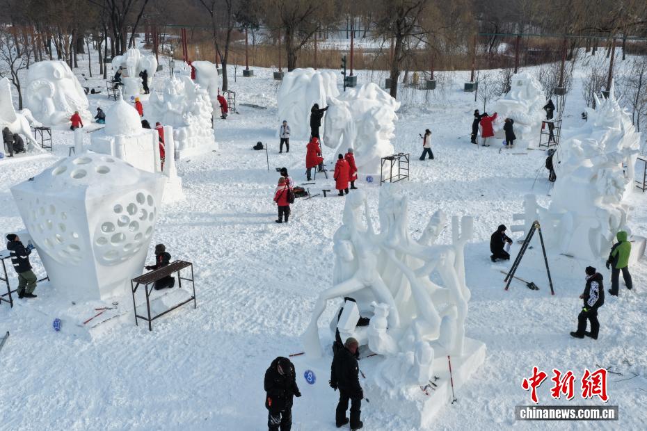 1月9日,第28届中国·哈尔滨国际雪雕比赛在太阳岛雪博会落幕,25件雪雕作品集中亮相。当日,在比赛现场,来自各国的百余位艺术家们正凝神专注做着最后的调整。据了解,本次比赛吸引来自白俄罗斯、比利时、波兰中国等13个国家25支代表队百余位艺术家参赛。图为各国选手为作品进行收尾工作。(无人机照片)于琨 摄