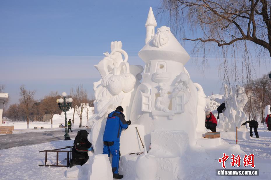 1月9日,第28届中国·哈尔滨国际雪雕比赛在太阳岛雪博会落幕,25件雪雕作品集中亮相。当日,在比赛现场,来自各国的百余位艺术家们正凝神专注做着最后的调整。据了解,本次比赛吸引来自白俄罗斯、比利时、波兰中国等13个国家25支代表队百余位艺术家参赛。图为西班牙队选手为作品《雾中幻梦》做最后调整。于琨 摄