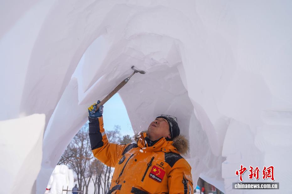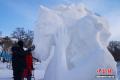 1月9日,第28届中国·哈尔滨国际雪雕比赛在太阳岛雪博会落幕,25件雪雕作品集中亮相。当日,在比赛现场,来自各国的百余位艺术家们正凝神专注做着最后的调整。据了解,本次比赛吸引来自白俄罗斯、比利时、波兰中国等13个国家25支代表队百余位艺术家参赛。图为中国二队选手为作品《以梦为马》进行收尾工作。中新社记者 赵宇航 摄