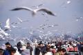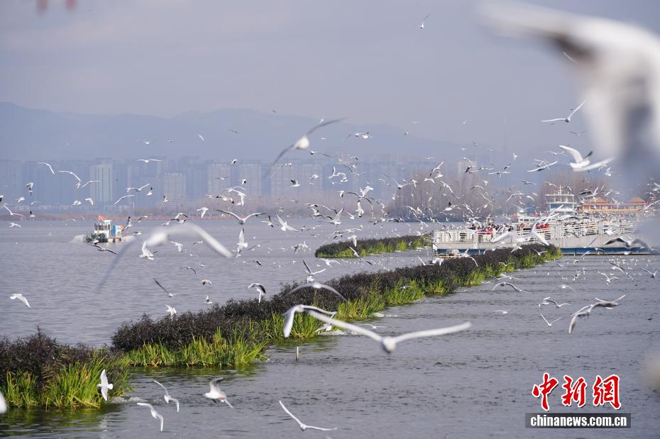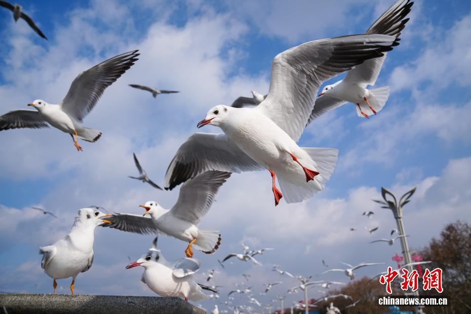 1月9日,昆明天气放晴、气温回升,不少市民和游客来到滇池边观赏美景、投喂红嘴鸥。图为滇池边飞舞的红嘴鸥。中新社记者 刘冉阳 摄