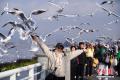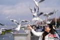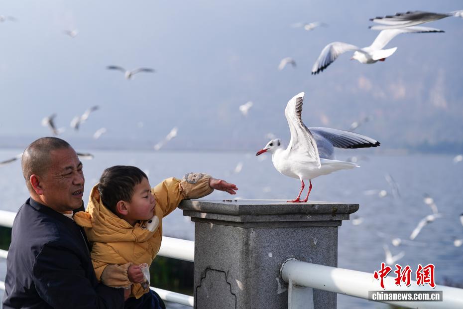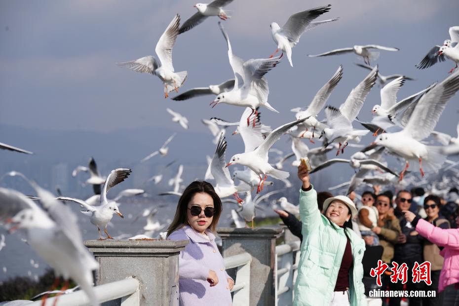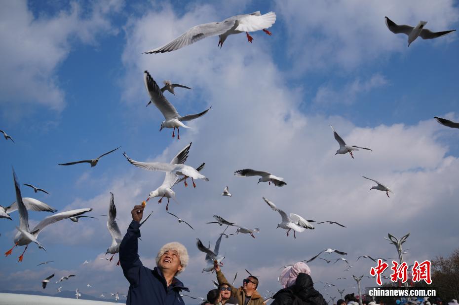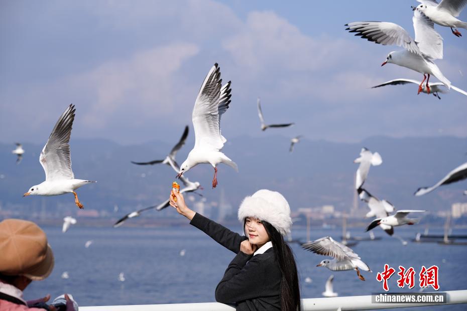 1月9日,昆明天气放晴、气温回升,不少市民和游客来到滇池边观赏美景、投喂红嘴鸥。中新社记者 刘冉阳 摄