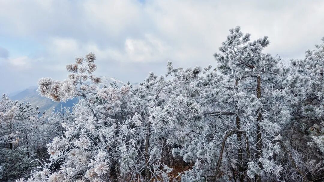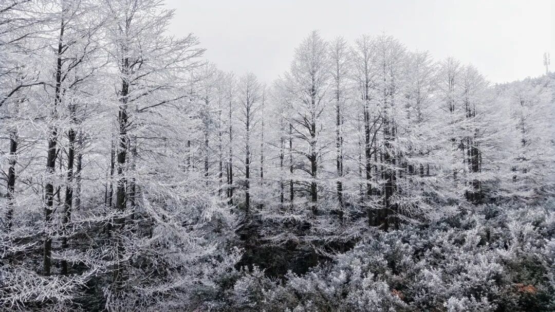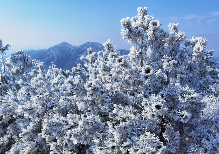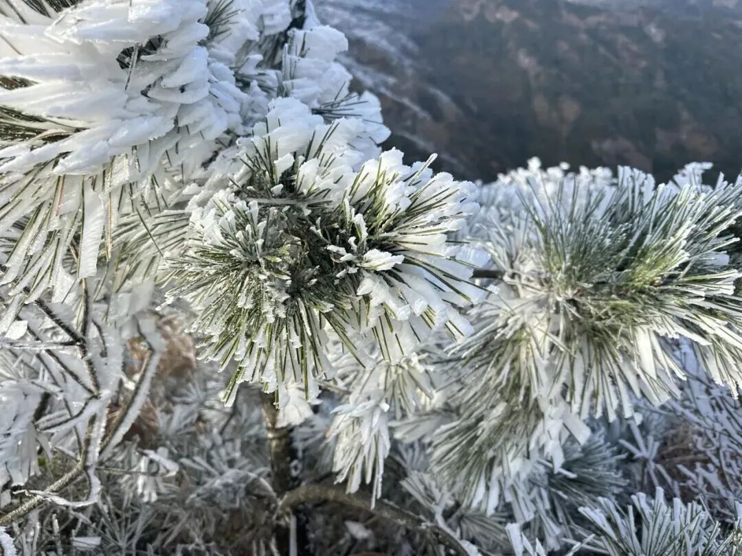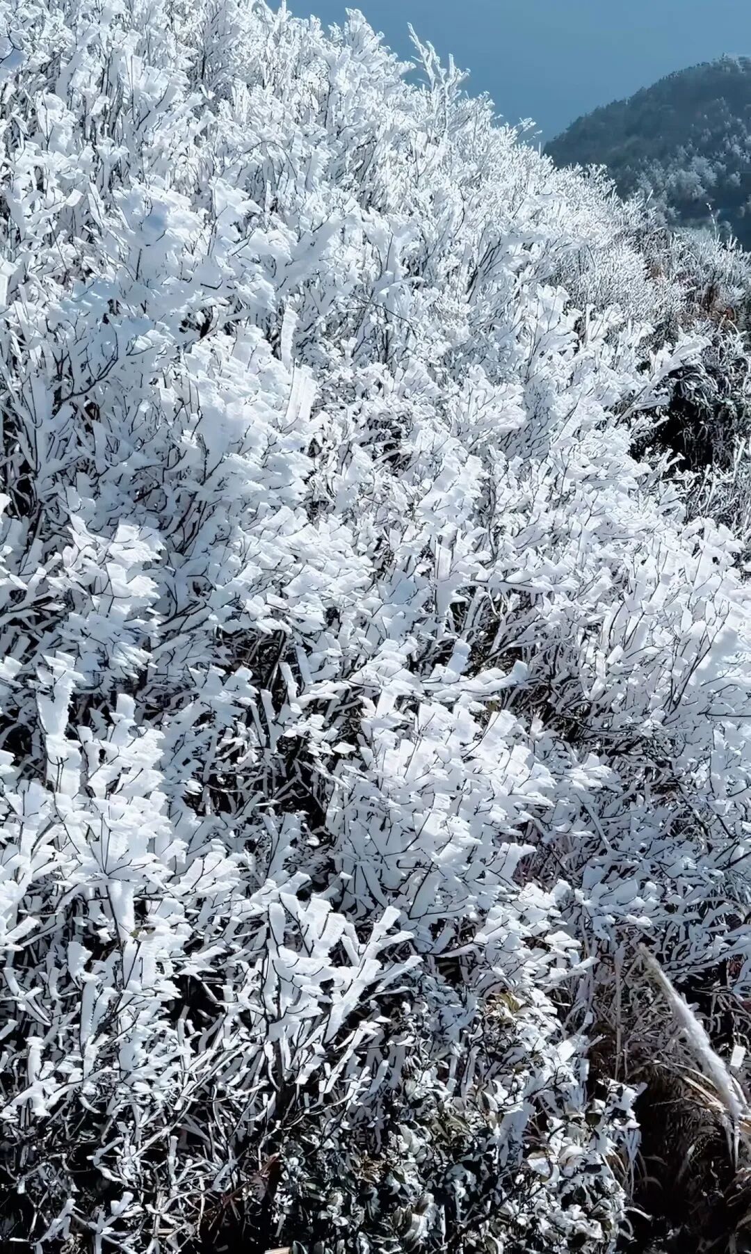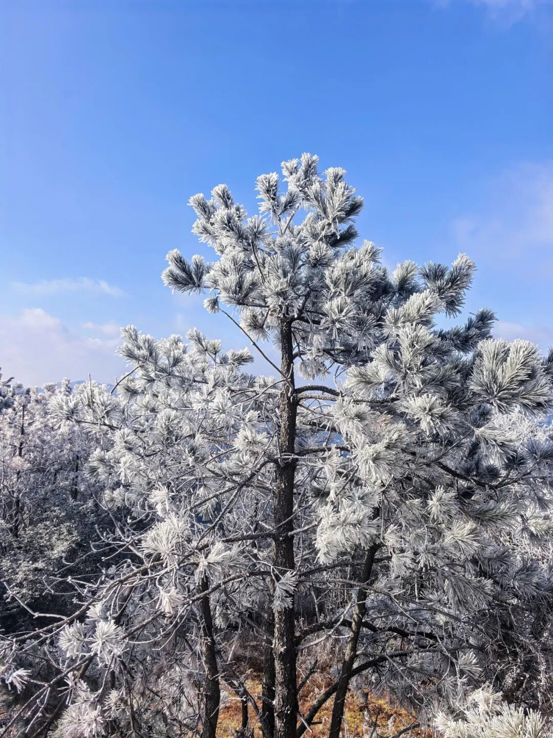 雾凇俗称树挂,是低温时空气中的水汽直接凝华,或过冷雾滴直接冻结而成,是非常难得的自然奇观。