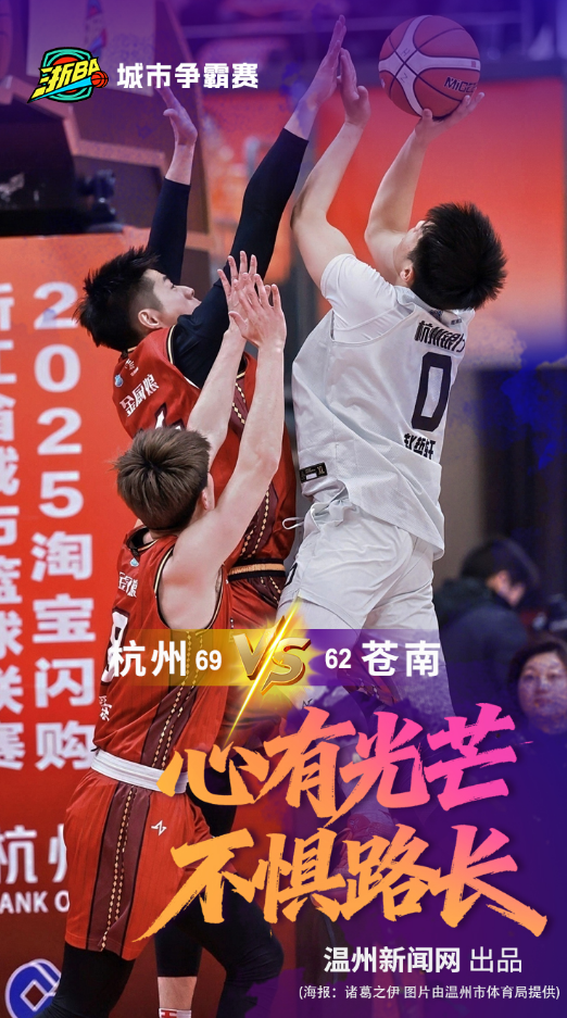 温州网讯(记者 温婉)1月14日19时,浙BA城市争霸赛首轮淘汰赛首场较量在拱墅运河体育公园体育馆拉开战幕,苍南队远赴客场,与东道主杭州队展开激烈角逐。开场后,面对实力不俗的对手,苍南队的球员们毫不怯场,迅速进入比赛状态。上半场,杭州队依托默契的阵地配合与稳定的外线投射,逐步建立起比分优势。下半场,苍南队将士们咬紧牙关、奋勇争先,拼至最后一刻,但苍南队仍以62:69憾负对手。