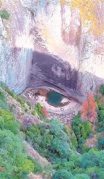 视频中国,这只“龙眼”整体轮廓清晰:潭中央残留的深绿色水域宛如深邃的“瞳孔”,周围浅米色与灰褐色岩壁构成了“眼白”,上方深色岩石凹陷则形似“上眼睑”褶皱。整只“眼睛”镶嵌在灰白色崖壁底部,与下方深绿树林形成鲜明对比,更显生动立体。不少网友调侃称,这还是一只拥有“双眼皮”的龙眼。