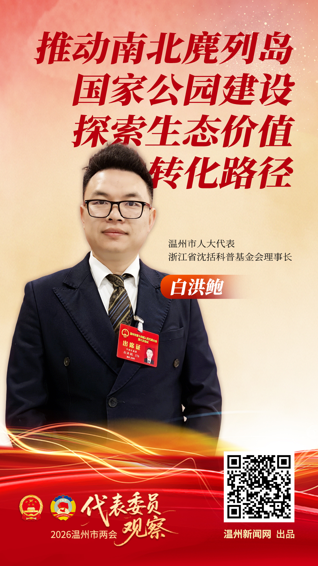 温州网讯 (记者 杨丽)1月20日上午,温州市第十四届人民代表大会第六次会议在温州市人民大会堂开幕。“生态保护”与“绿色发展”成为代表委员热议的高频词。温州市人大代表、浙江省沈括科普基金会理事长白洪鲍在接受温州新闻网《代表委员观察》栏目采访时,建议温州全力推动南北麂列岛国家公园创建,探索具有海洋特色的“绿水青山就是金山银山”实践路径,为全国海洋生态保护与高质量发展提供“温州示范”。