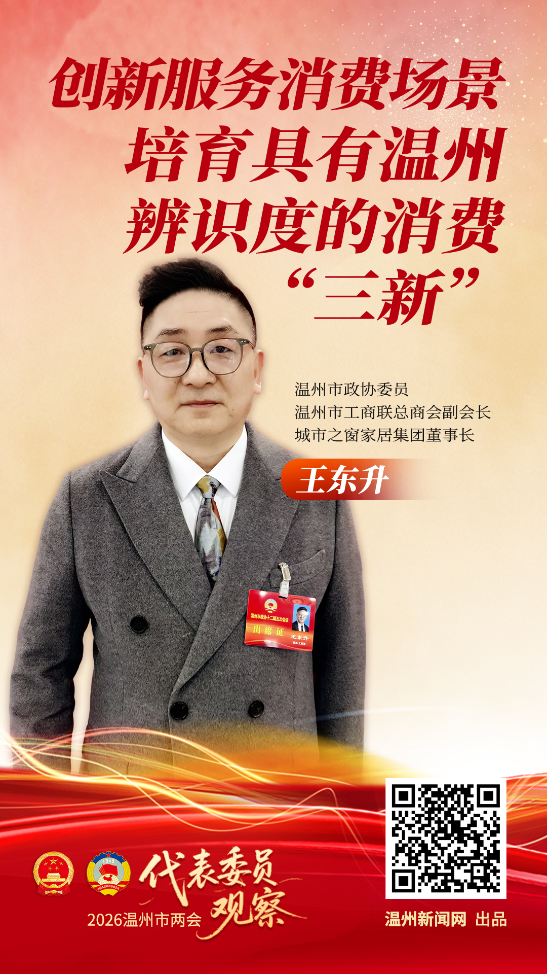 温州网(记者 杨丽)新征程,新气象。温州市“两会”期间,代表委员们把基层声音带到会场,积极为温州奋进“十五五”献计献策。温州市政协委员、温州市工商联总商会副会长,城市之窗家居集团董事长王东升在接受温州新闻网《代表委员观察》栏目采访时建议,创新服务消费场景,推动消费升级,培育具有温州辨识度的消费“三新”,以此撬动浙南闽北赣东区域超3000万人口的庞大消费市场。