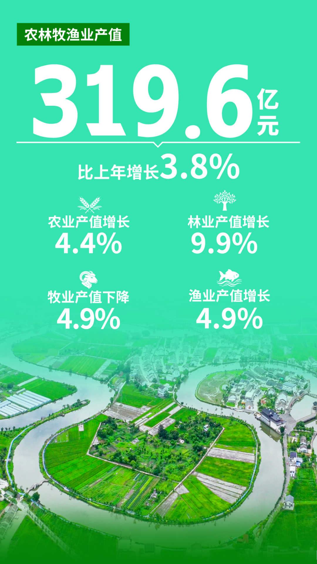 2025年,全市农林牧渔业产值319.6亿元,比上年增长3.8%,其中农业、林业、渔业产值分别增长4.4%、9.9%、4.9%,牧业下降4.9%。扎实推进粮油等主要作物大面积单产提升行动,全市粮食播种面积171.0万亩,粮食作物总产量71.6万吨,比上年增长1.4%,实现连续增长。经济作物增产增收,中草药材、园林水果、蔬菜产量分别比上年增长6.6%、5.3%和4.1%。畜牧产能总体稳定,生猪出栏95.2万头,比上年下降7.7%。渔业保持较快增长,水产品总产量82.4万吨,比上年增长4.6%。